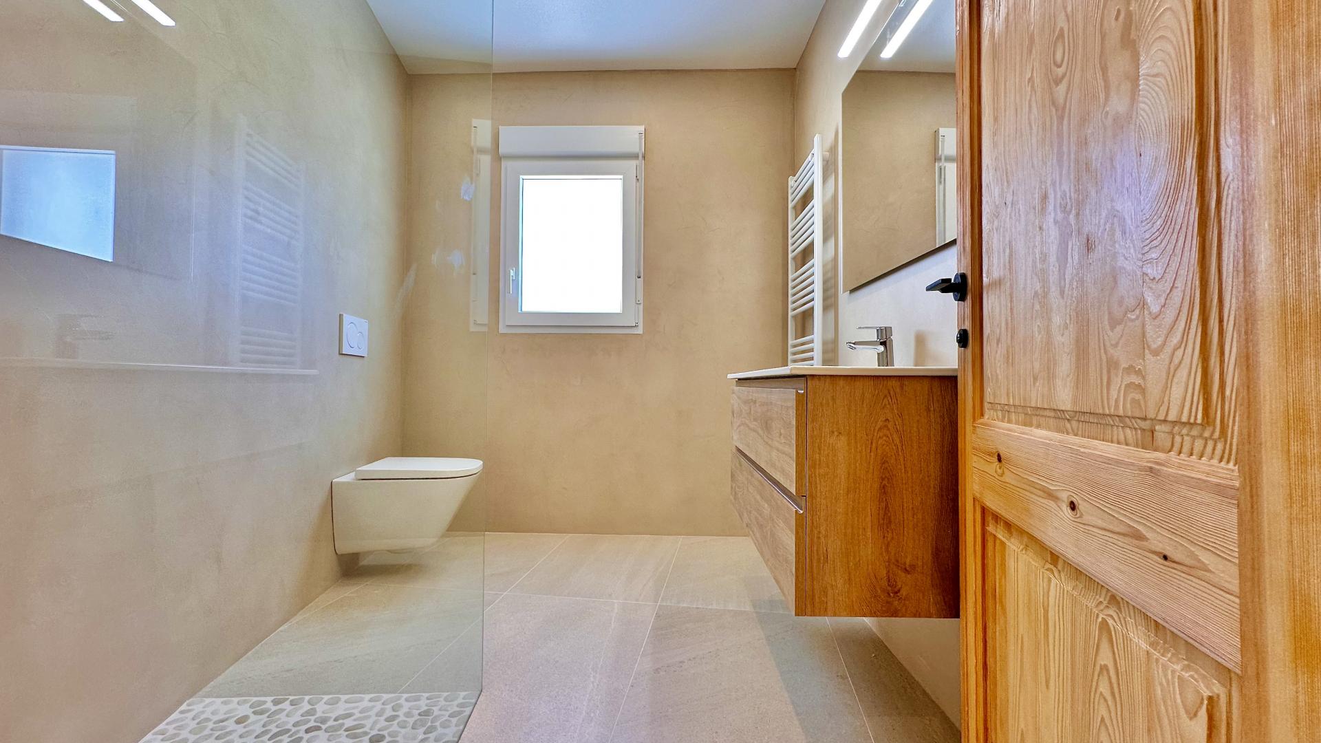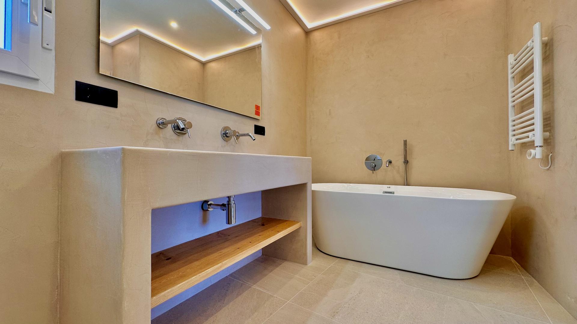 PROPERTY DETAILS Step inside, and you’re welcomed by an atmosphere of timeless sophistication. The villa boasts six generously sized bedrooms, including a master suite with an ensuite bathroom and a terrace from which to enjoy the sea views. The bathrooms are finished with micro-cement walls, complemented by tempered glass shower screens and furniture that exudes rustic charm with its woodgrain textures. The solid wooden interior doors, in a natural finish, harmonise with the home’s soft palette, creating a warm and inviting environment. The living area is designed for both relaxation and entertainment, featuring a modern electric fireplace that adds a cosy touch during cooler evenings. The adjoining kitchen is a culinary delight, fully equipped with integrated Bosch appliances and an American bar, making it perfect for hosting guests or enjoying casual meals with family. Throughout the interior, 90x90 ceramic stoneware flooring, mimicking the look of cement, ties together the villa’s modern aesthetic with its Mediterranean roots.