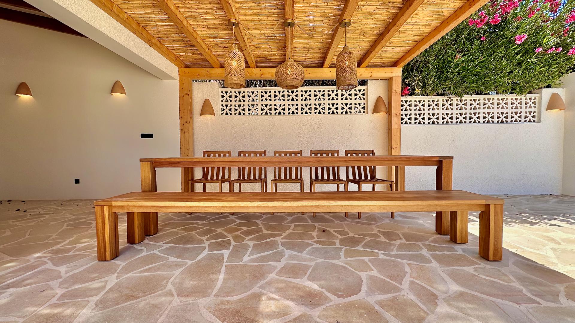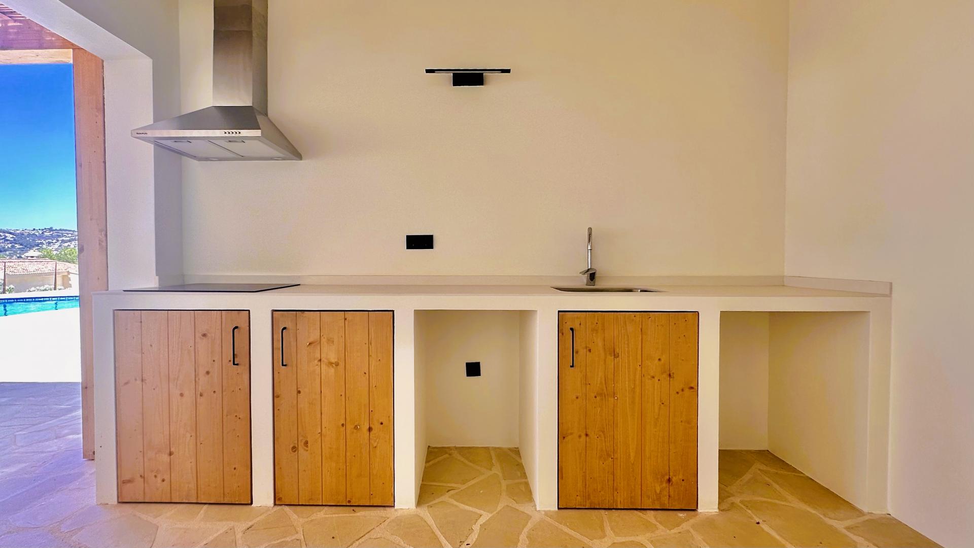 Designed for year-round enjoyment, the villa’s kidney-shaped pool is a standout feature. Heated and illuminated with LED lighting, it’s perfect for both daytime dips and night-time swims under the stars. Surrounding the pool, the terrace is finished with natural Bavarian stone, exuding charm and durability. An enchanting outdoor kitchen, covered with a pinewood pergola and double reed fencing, offers built-in furniture, a sink, and ample space for preparing and enjoying meals outdoors. This area is ideal for summer barbecues, casual gatherings, or simply savouring Mediterranean evenings with a glass of wine. The landscaped garden completes the villa’s outdoor allure, featuring a vibrant array of fruit trees and oleanders, with gravel-lined sections adding texture and ease of maintenance. The garden is fitted with an automatic drip irrigation system, ensuring its beauty with minimal effort.