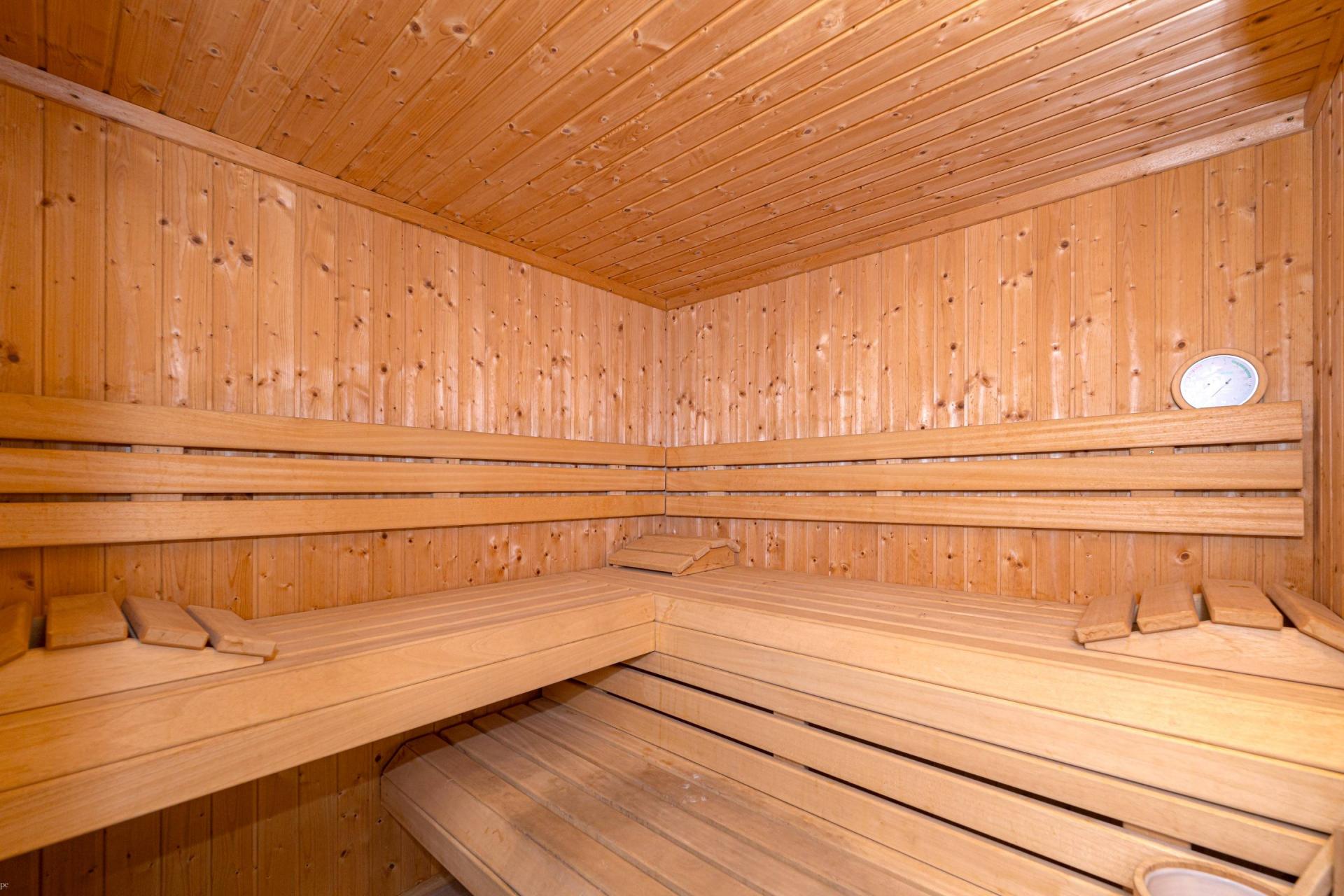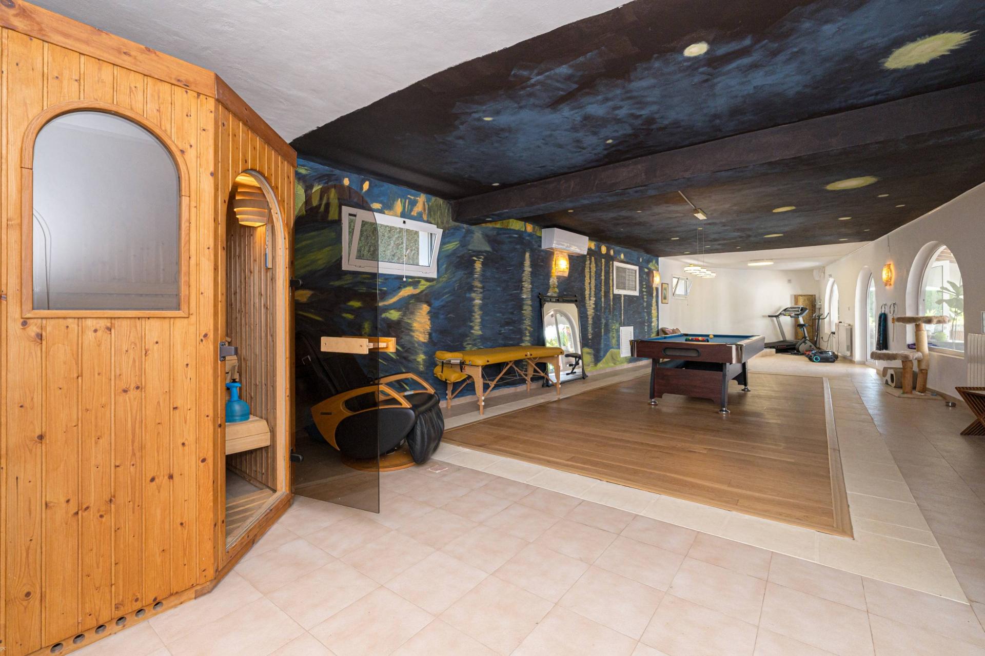 Luxurious Wellness & Leisure Amenities This villa is designed to enjoy leisure and well-being regardless of the weather. The lower level is home to a versatile 80 m² space dedicated to relaxation and fitness, including a fully equipped gym, spa, sauna, billiards area, and an indoor heated swimming pool (currently unused). This area seamlessly connects to an expansive outdoor terrace, creating a fluid transition between indoor and outdoor living.
