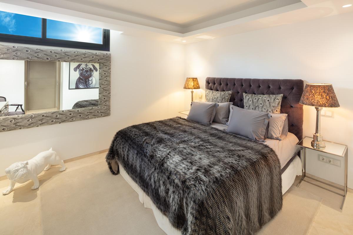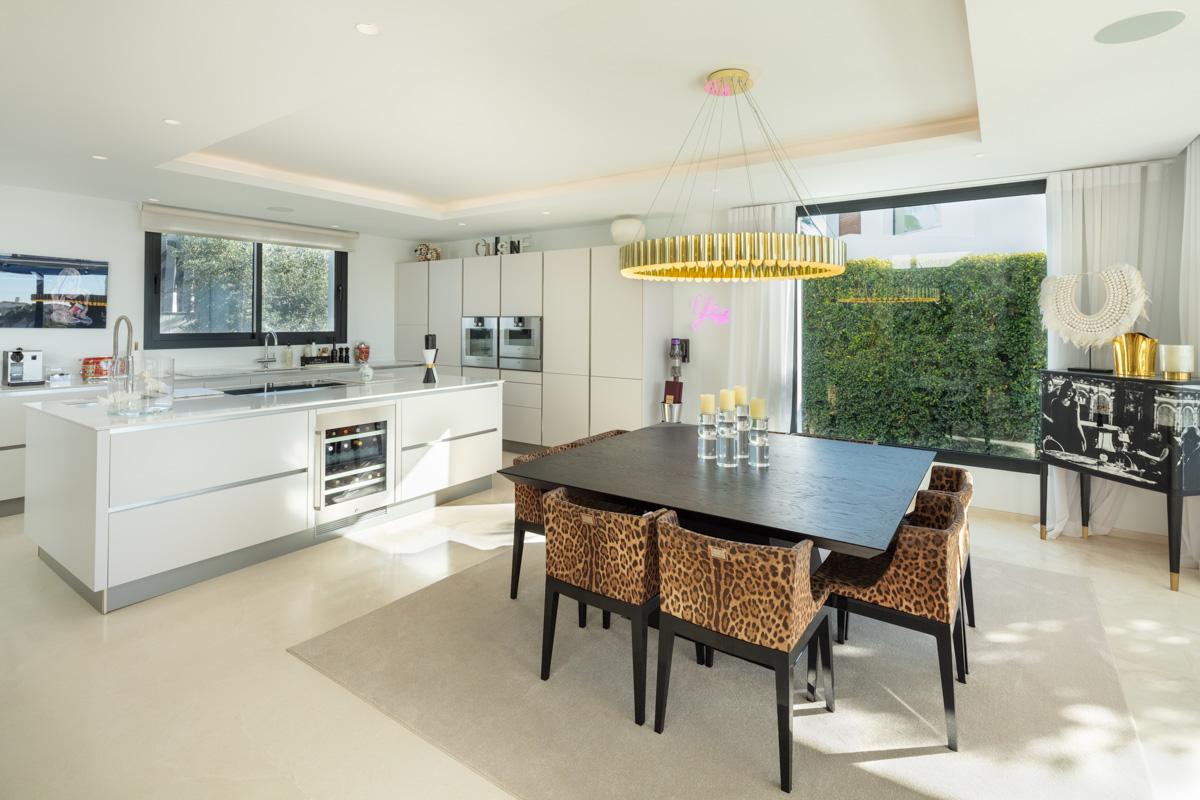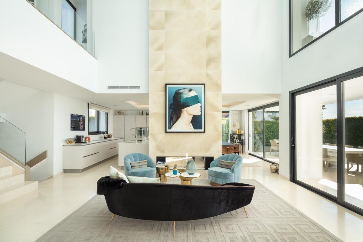 Inside, the villa welcomes you with a chic Scandinavian-inspired interior design that combines sophistication with warmth. The heart of the home is a grand living area, where high ceilings and floor-to-ceiling windows flood the space with Andalusian sunlight. A striking marble-encased fireplace anchors the room, adding a touch of homely charm to the expansive layout. Adjacent to this, the open-plan kitchen and dining area is a masterpiece of functionality and style. Fully equipped with top-of-the-line GAGGENAU appliances, the kitchen features a marble worktop, sleek neutral cabinetry, and a central island with a wine fridge—perfect for culinary adventures and casual gatherings.