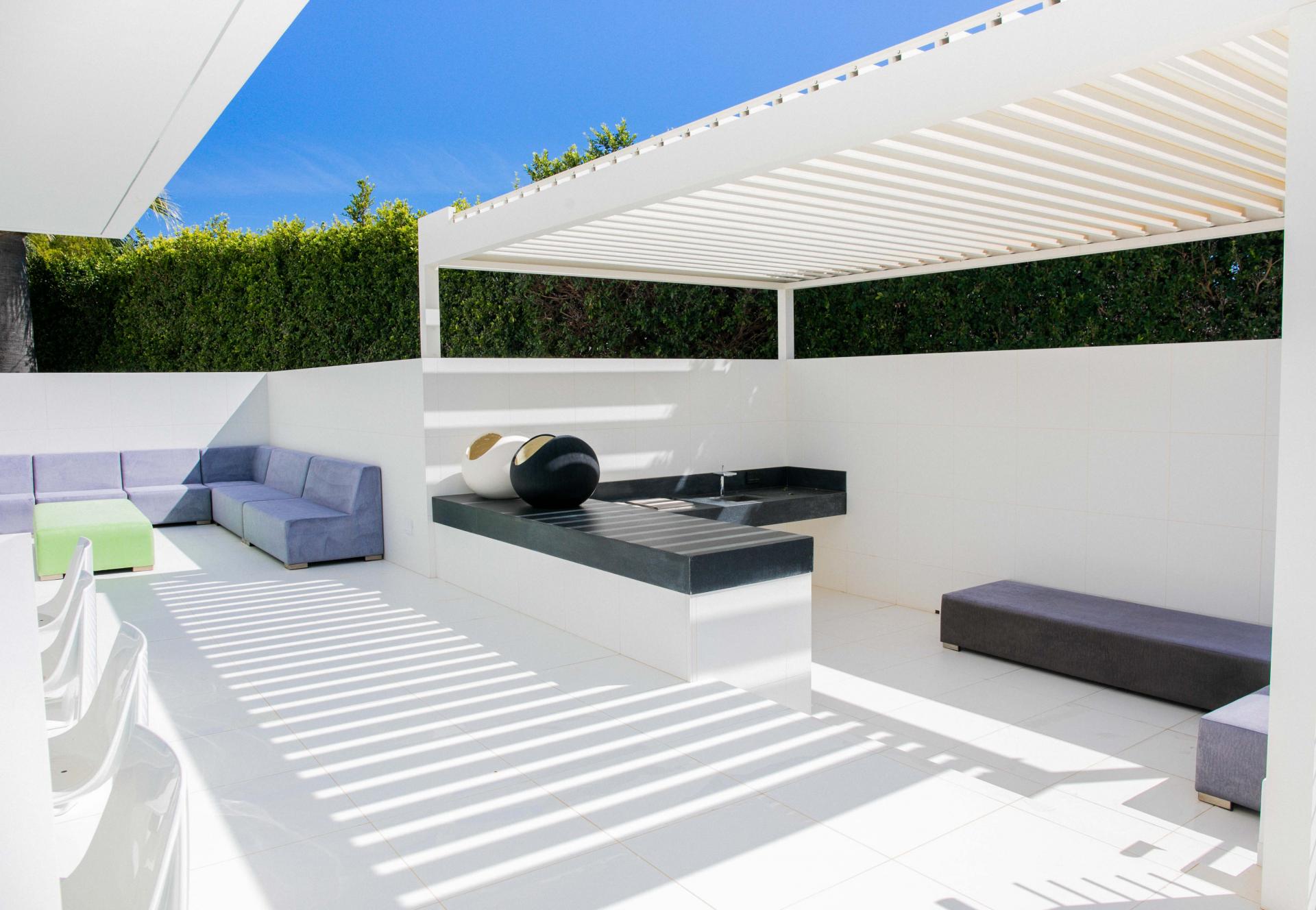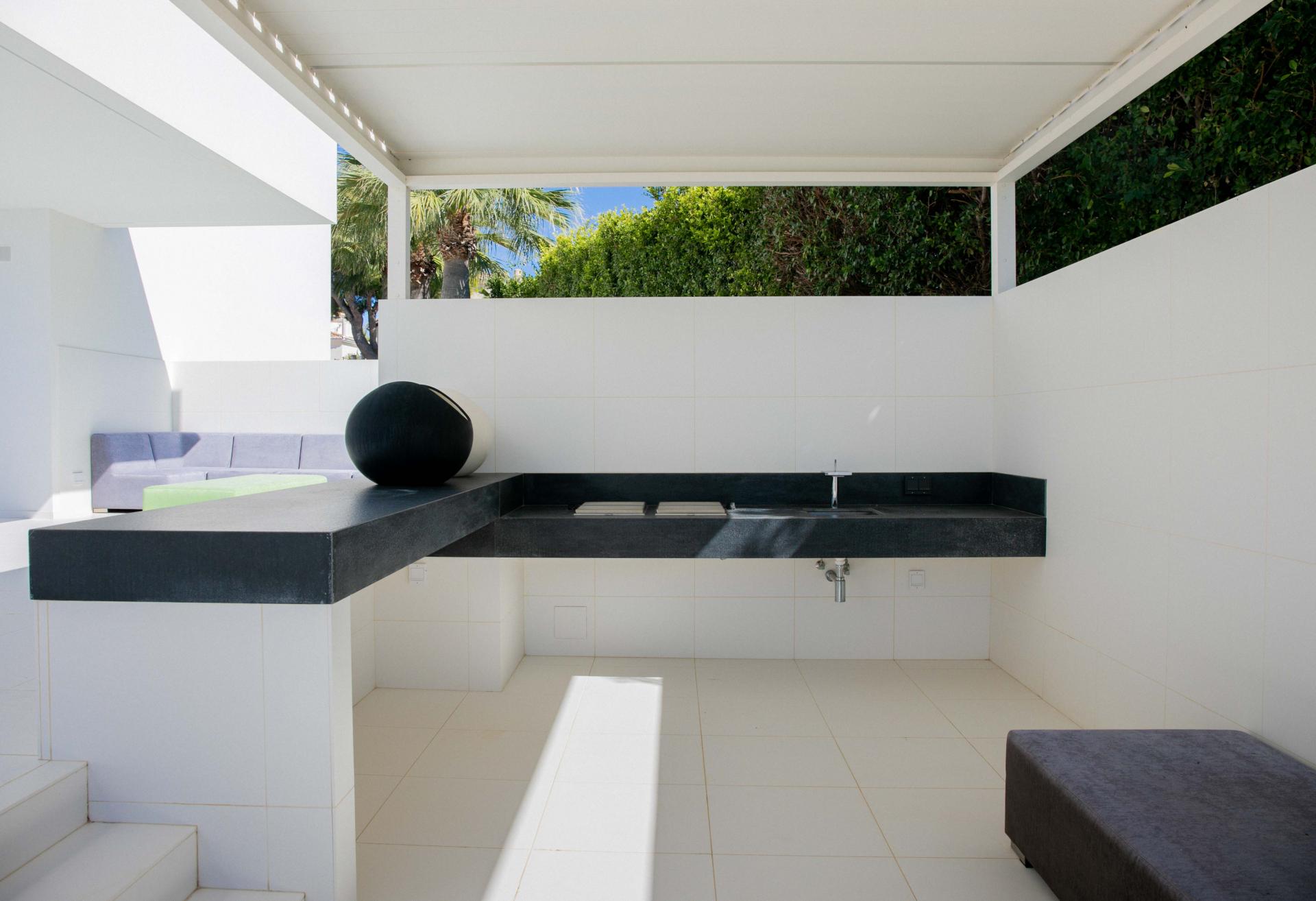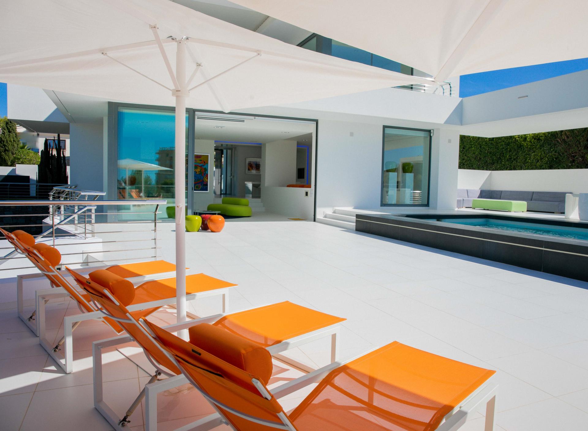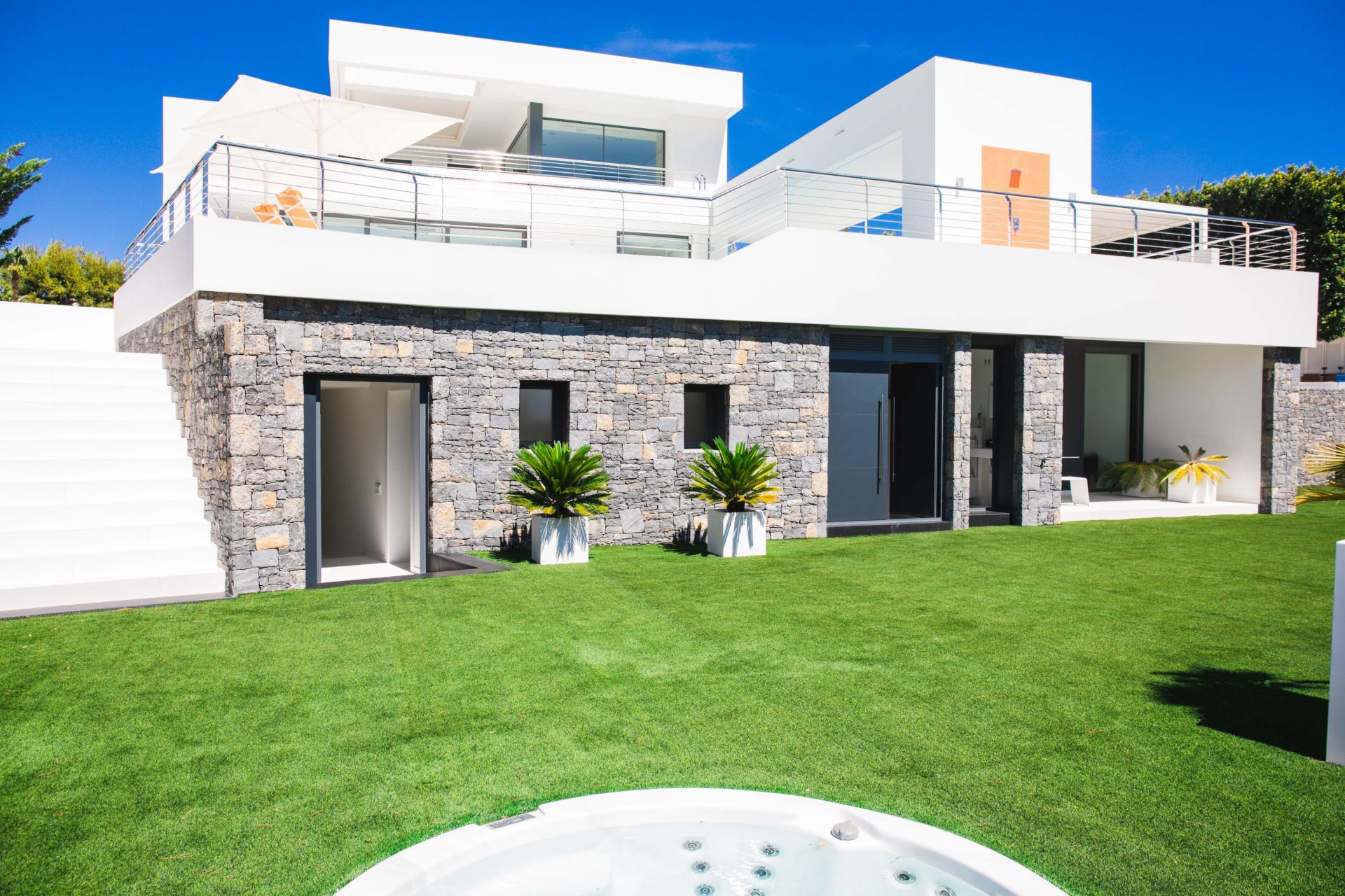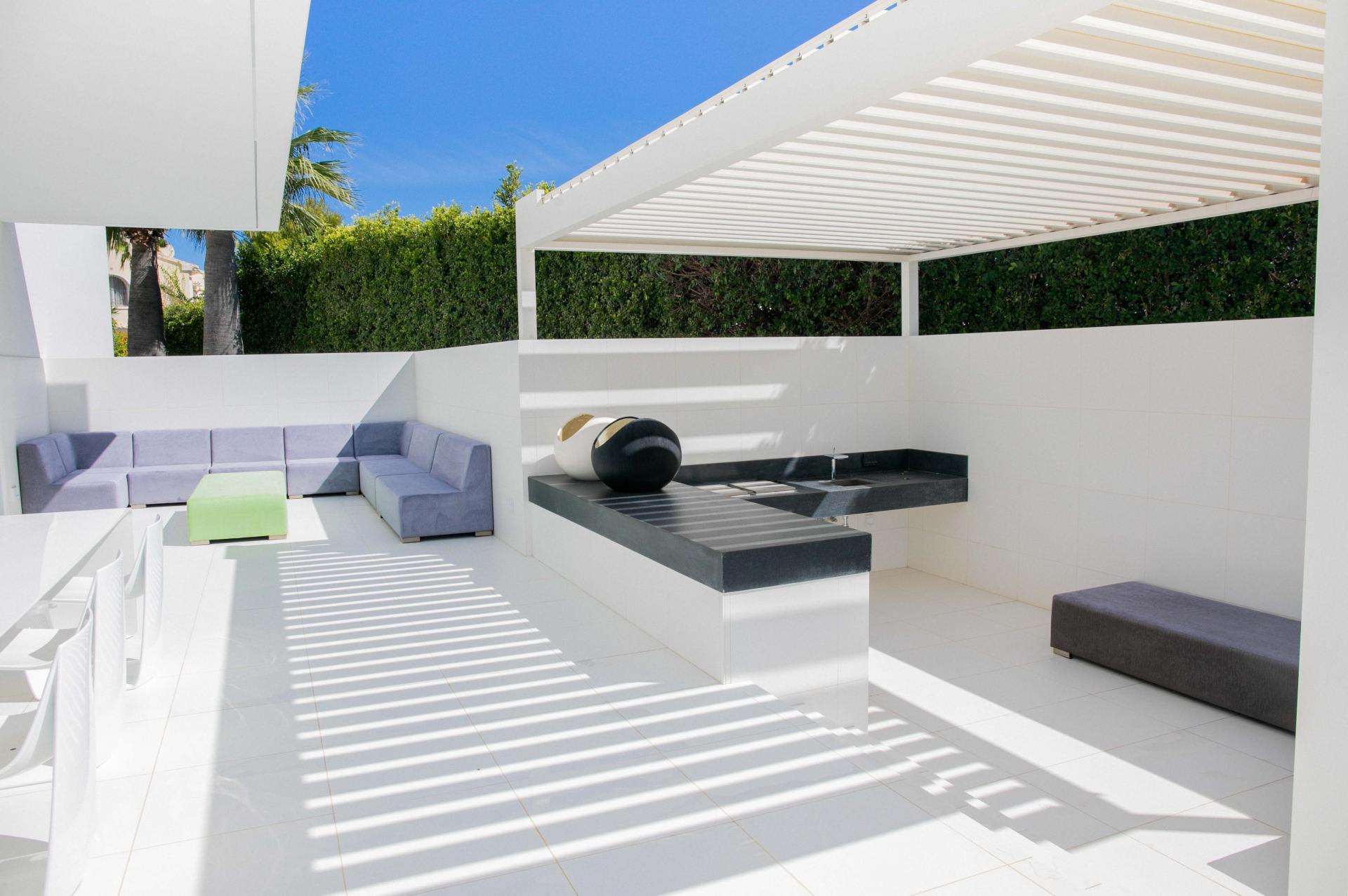 As you step outside, you will be greeted by a modern barbecue and chill out lounge terrace, an outdoor summer kitchen pergola, and a jacuzzi, all perfect for enjoying the beautiful weather. The pool area is particularly impressive, offering stunning sea views that are unrivalled in the market. The garden is low-maintenance thanks to the irrigation system and partly high-quality artificial grass, and it even includes some local fruit trees.