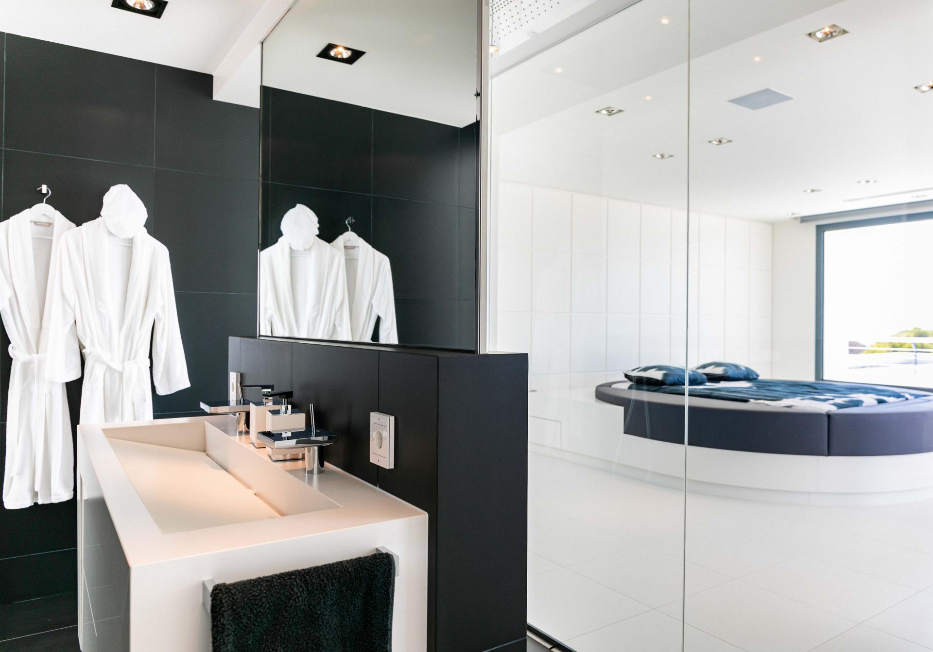 This villa is truly impressive, spanning across three floors with a total of seven bedrooms and seven bathrooms. The main living area is a spacious 100 m2 living-dining room that is perfect for entertaining guests or relaxing with family. The fully equipped kitchen features a cooking island and is connected to a spacious dining and living room area that features a cosy fireplace.