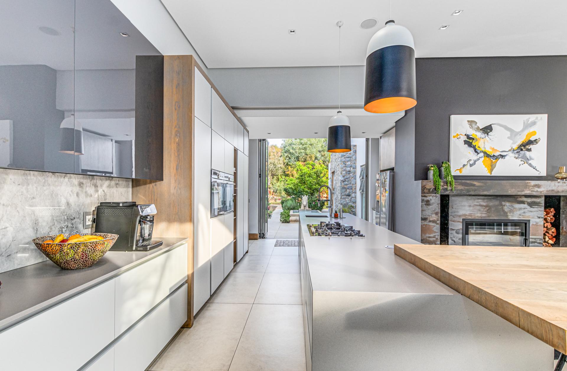 The stylish gourmet kitchen has two ovens, a gas stove top, a huge pantry and is completed with separate laundry and scullery spaces. There are two oversized double garages, positioned well to access the main house. A central courtyard brings in natural light to the kitchen and connects the studio cottage and outdoor sports area.