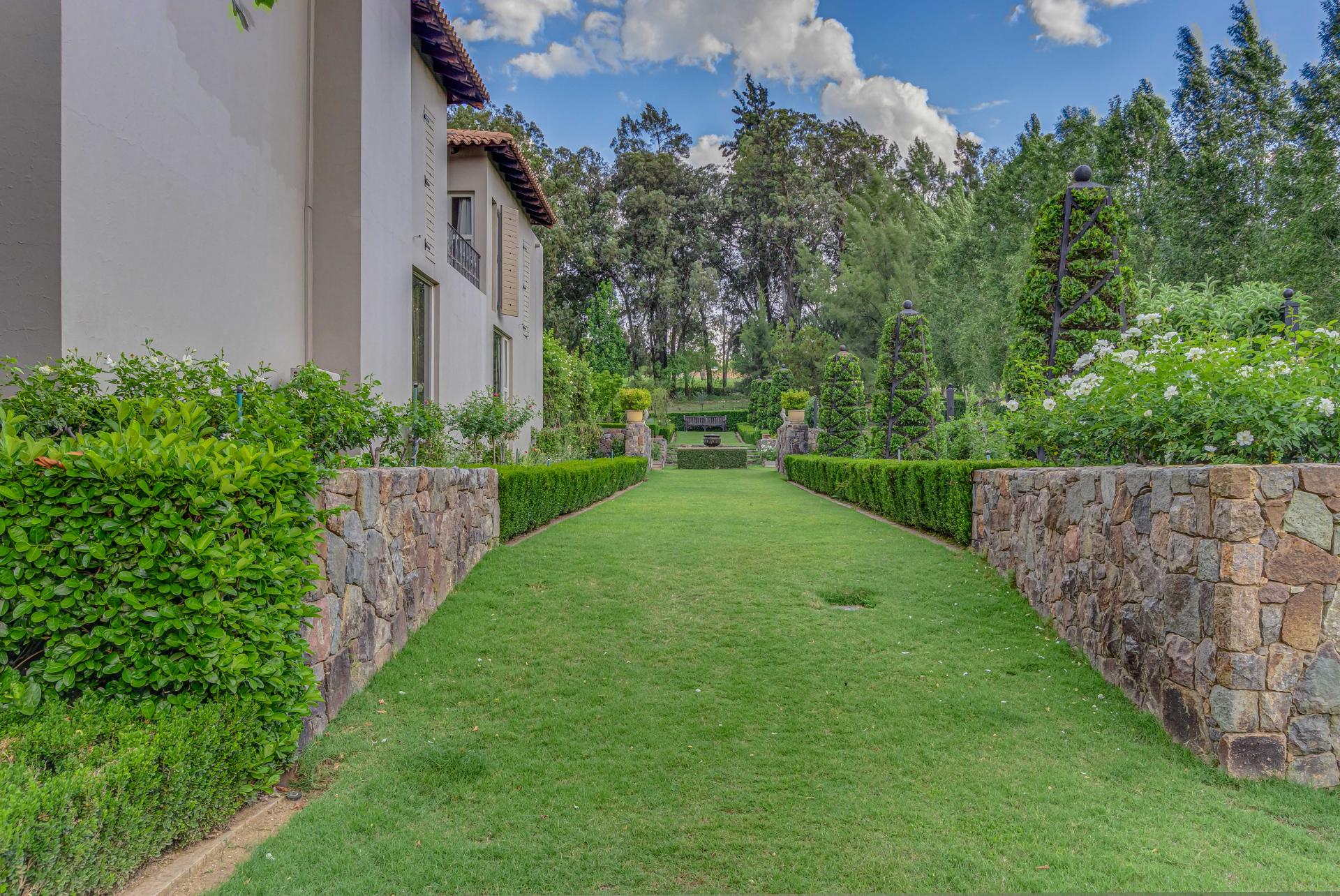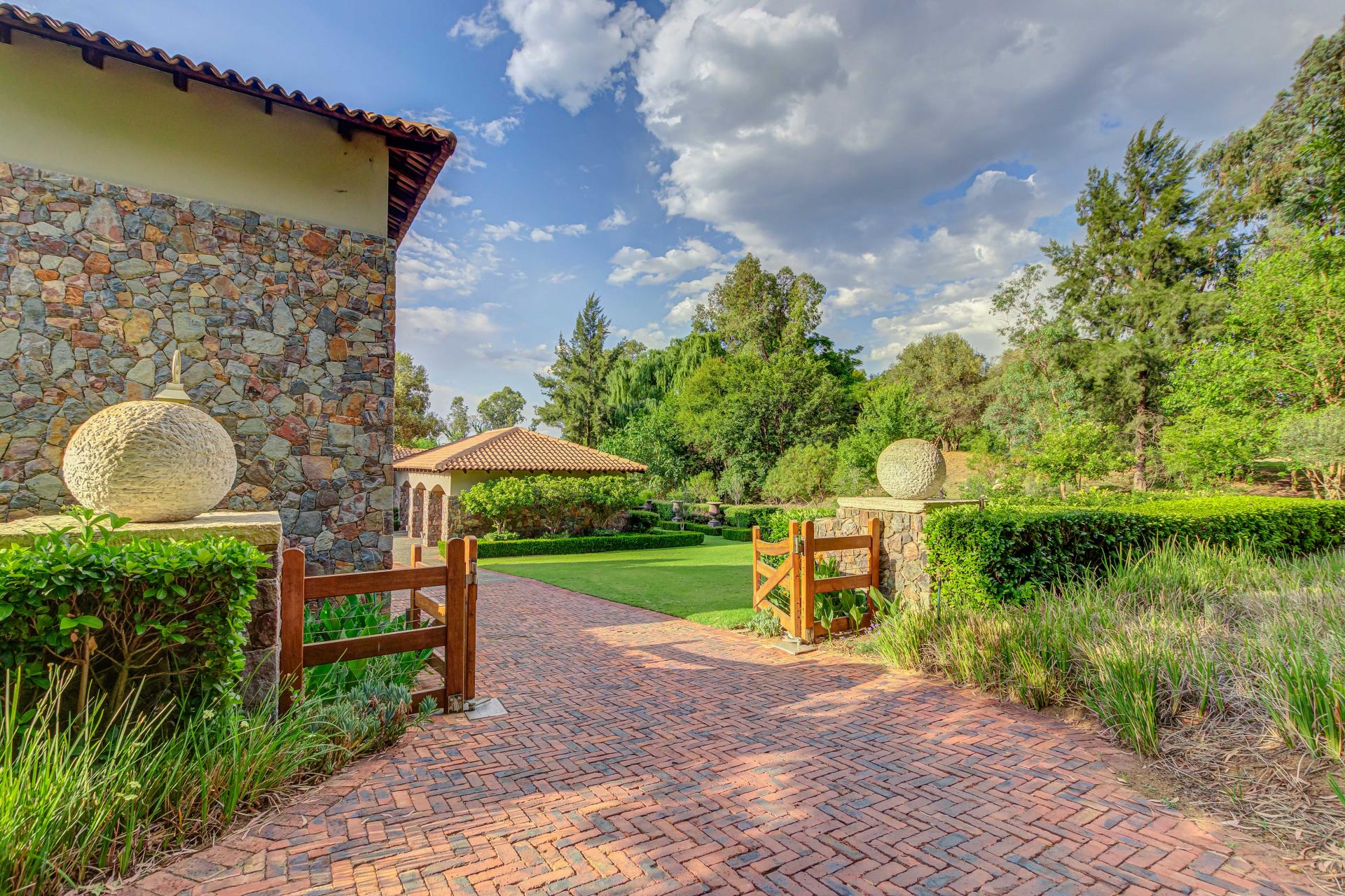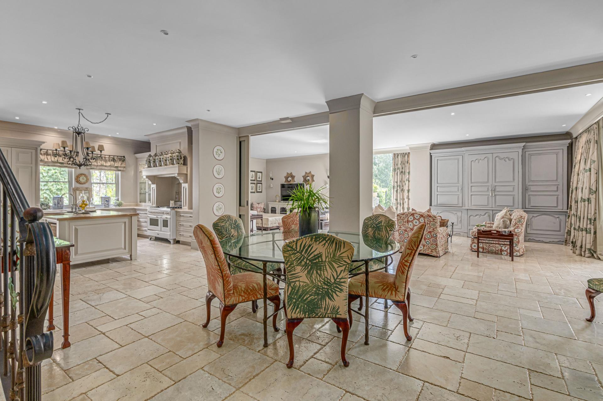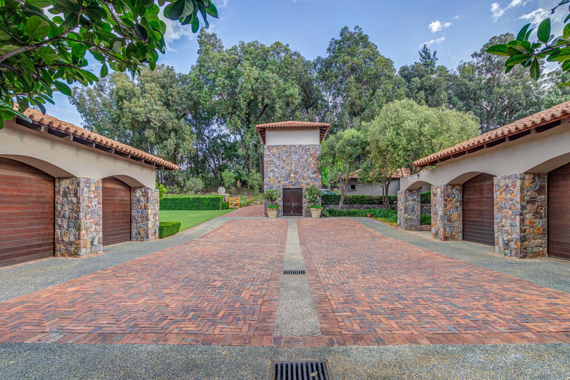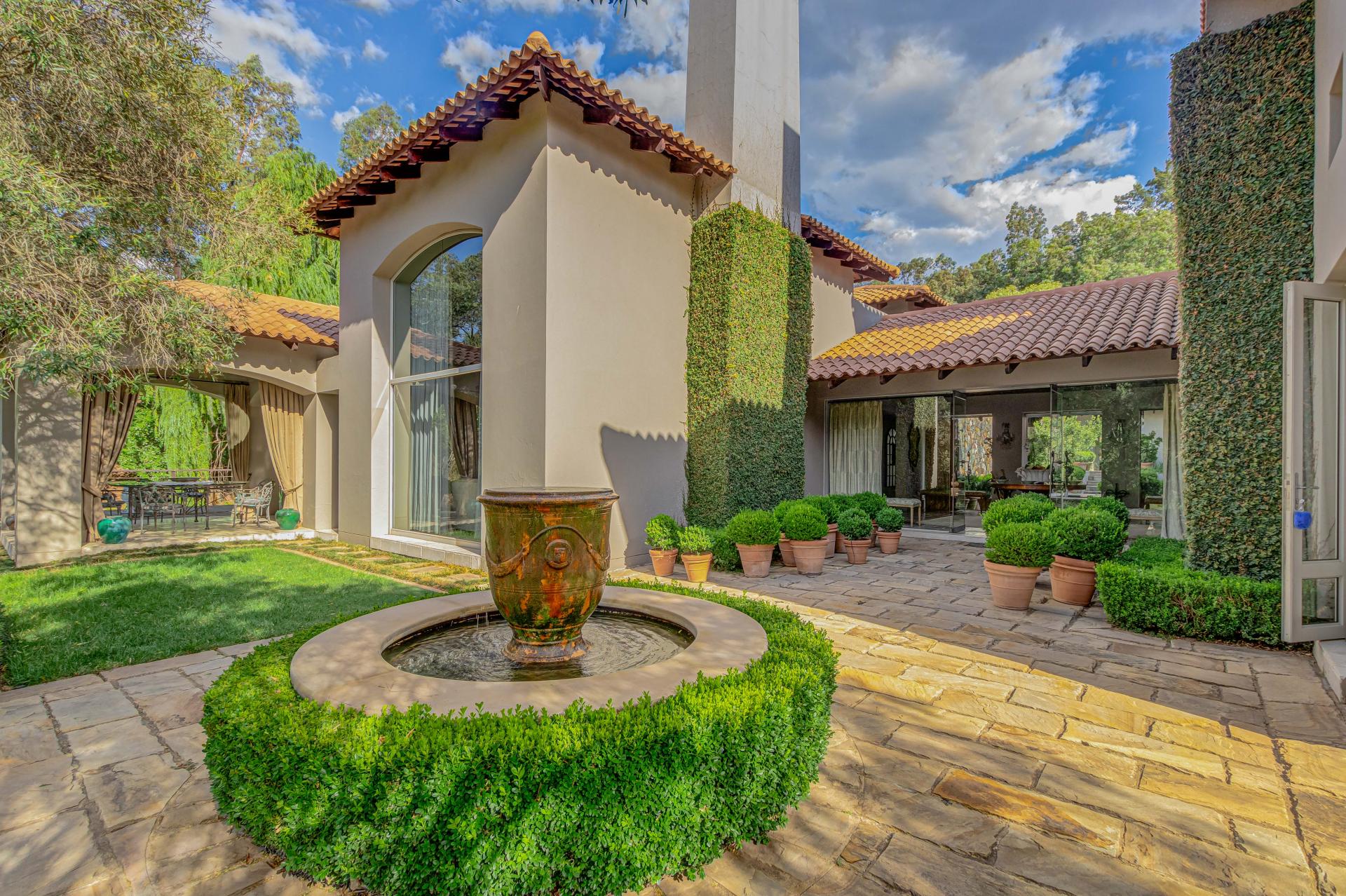 Step into this classic villa and be captivated with its beauty from the imported travertine floor tiles, roof tiles from Italy, crystal chandeliers and exterior stone brought in from India for the home. The property is split into two residences which are conveniently joined together but can be separated for complete privacy from one another. It is an ideal home for the multigenerational family where space is a requirement and multiple entertainment & relaxation areas are a must have. On one side of the property you will find three en-suite bedrooms upstairs, a grand gourmet country kitchen, beautiful central dining area, a champagne lounge and additional lounge/tv area all leading out onto the large covered patio with a built in concealed gas braai. There is a private dining room and lounge with extra high volume ceilings and a beautiful gas fire place. The kitchen leads to the brightest scullery area, which then takes you to the rose cutting/potting room with doors opening onto the stunning rose garden. This home is unique with this beautiful room which has an accent piece rose chandelier. Then walk into a beautiful laundry room which is connected to one set of three garages. The outdoor courtyards lead to the 3 bedroom cottage which can be used as staff quarters or as a separate residence all together. On the other side of the home are two beautifully sized bedrooms en suite, a large office, kitchen, atrium and very comfortable lounge/tv room leading onto its own patio and deck looking onto the garden and waterfall. This side of the home is completed with the second triple garage.