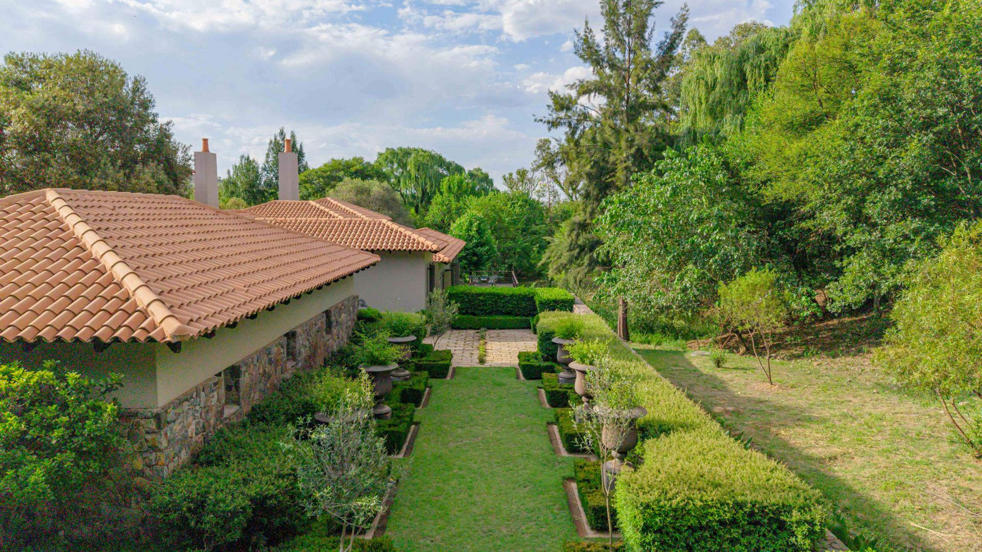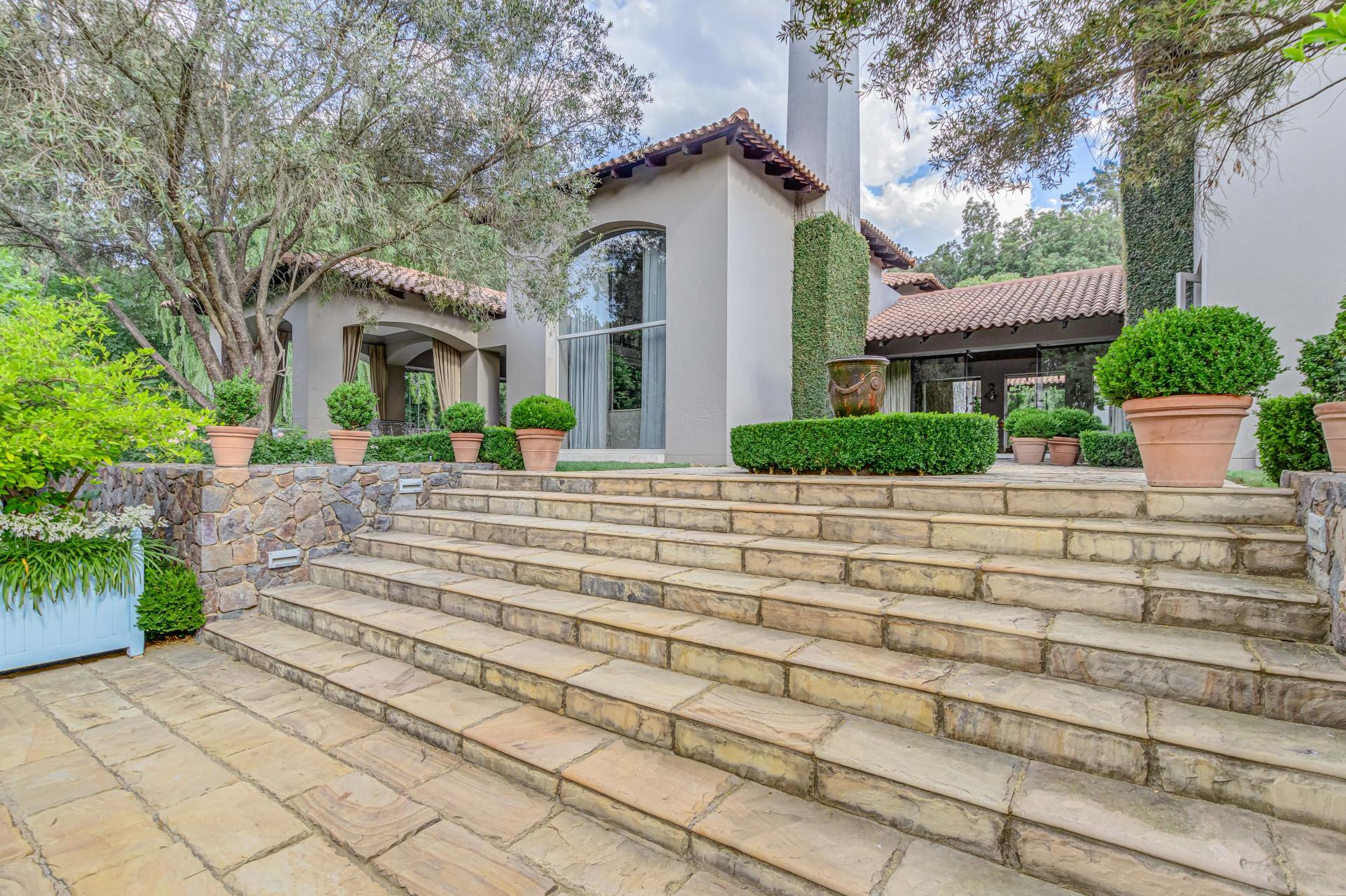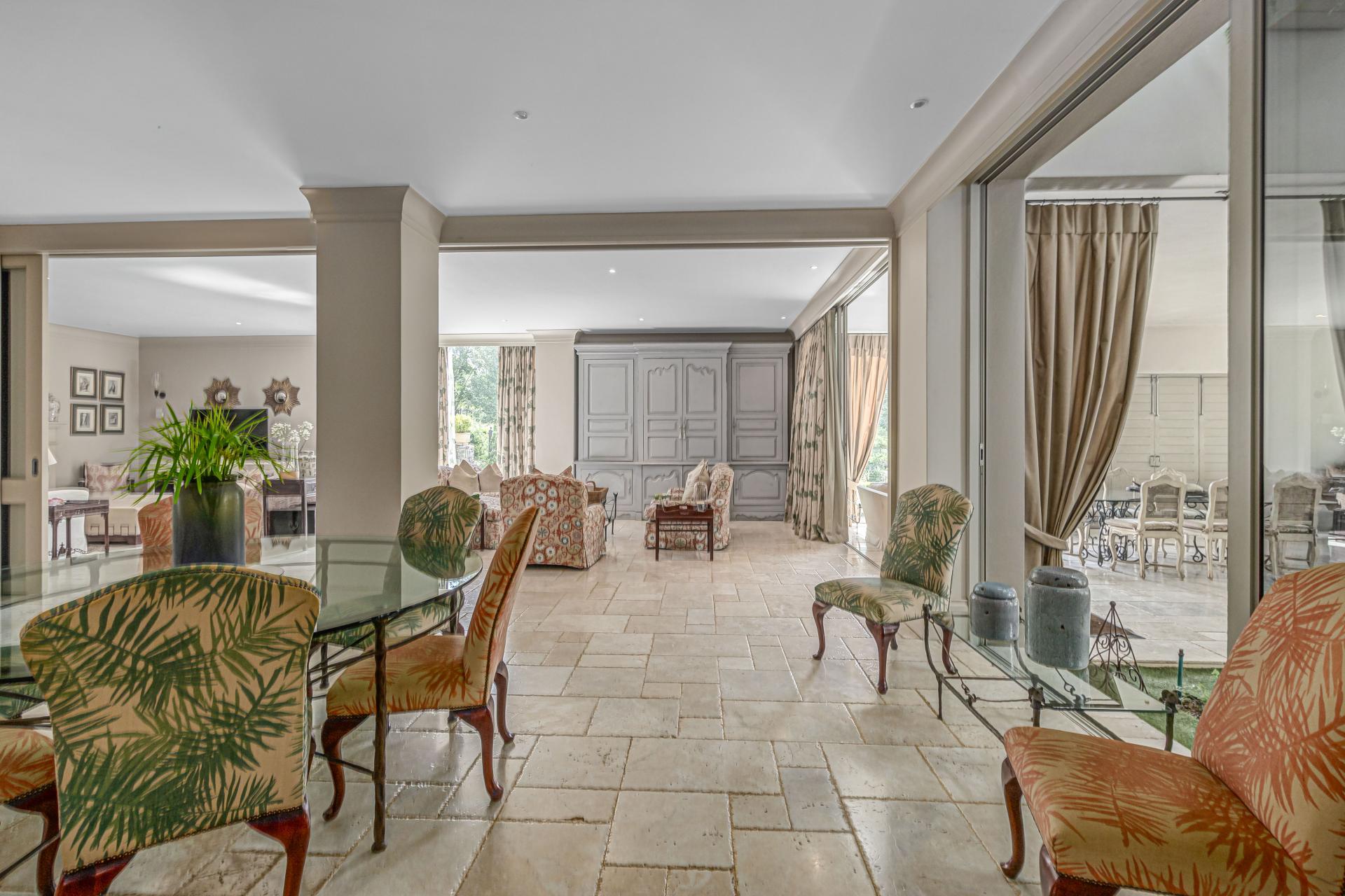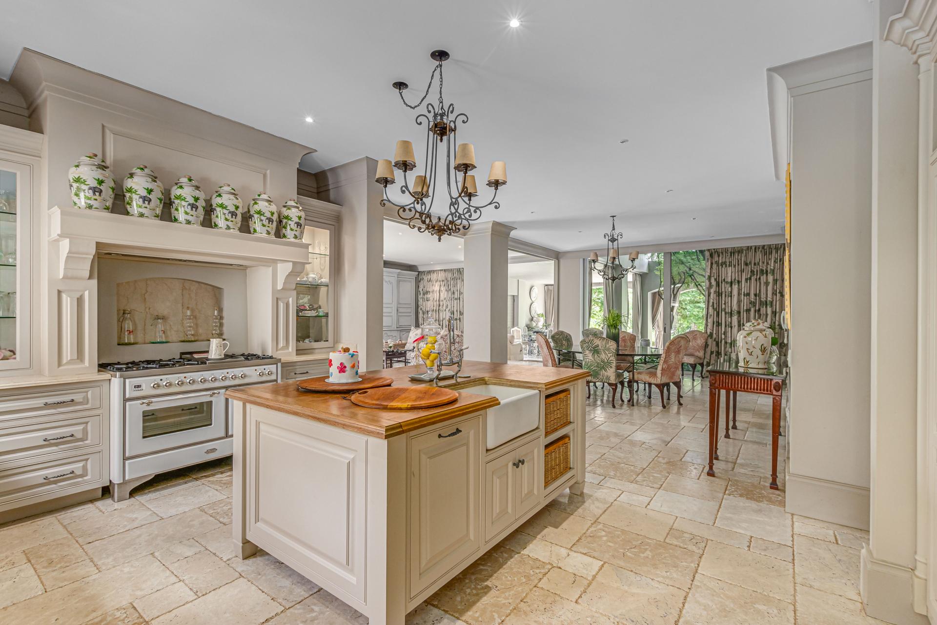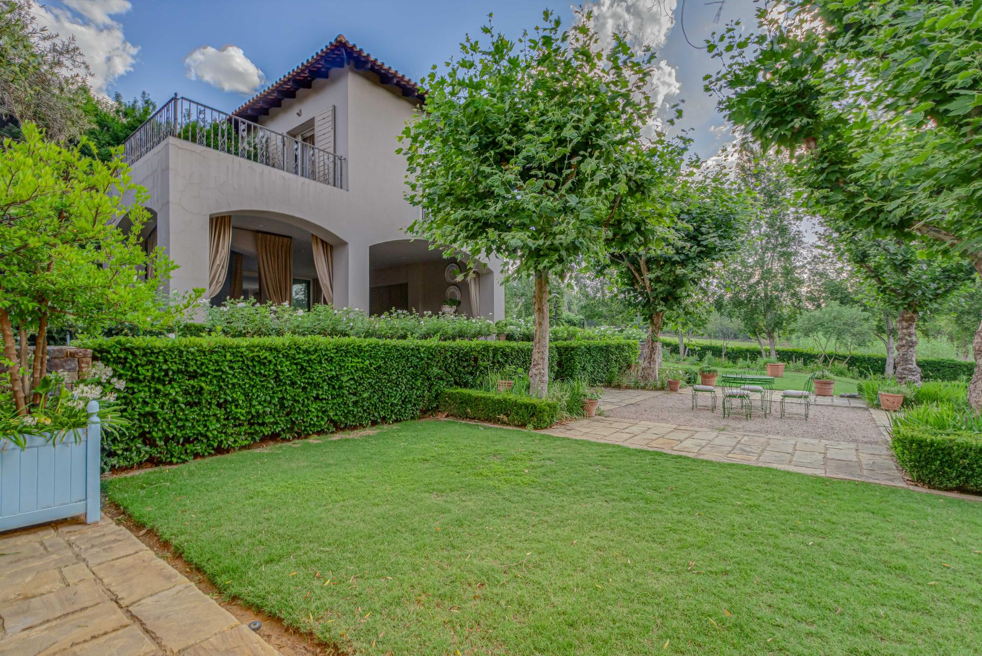 Step into this classic villa and be captivated with its beauty from the imported travertine floor tiles, roof tiles from Italy, crystal chandeliers and exterior stone brought in from India for the home. The property is split into two residences which are conveniently joined together but can be separated for complete privacy from one another. It is an ideal home for the multigenerational family where space is a requirement and multiple entertainment & relaxation areas are a must have. On one side of the property you will find three en-suite bedrooms upstairs, a grand gourmet country kitchen, beautiful central dining area, a champagne lounge and additional lounge/tv area all leading out onto the large covered patio with a built in concealed gas braai. There is a private dining room and lounge with extra high volume ceilings and a beautiful gas fire place. The kitchen leads to the brightest scullery area, which then takes you to the rose cutting/potting room with doors opening onto the stunning rose garden. This home is unique with this beautiful room which has an accent piece rose chandelier. Then walk into a beautiful laundry room which is connected to one set of three garages. The outdoor courtyards lead to the 3 bedroom cottage which can be used as staff quarters or as a separate residence all together. On the other side of the home are two beautifully sized bedrooms en suite, a large office, kitchen, atrium and very comfortable lounge/tv room leading onto its own patio and deck looking onto the garden and waterfall. This side of the home is completed with the second triple garage.