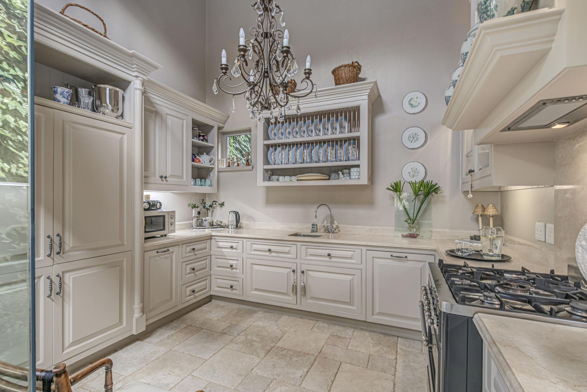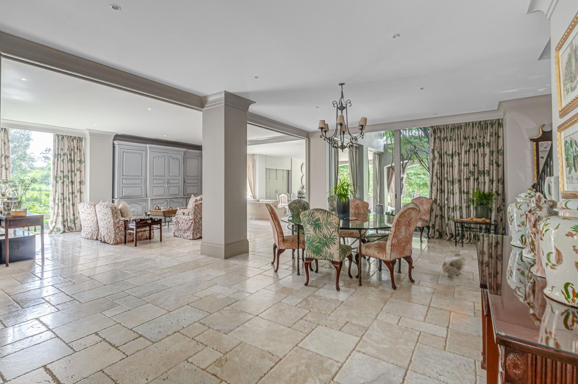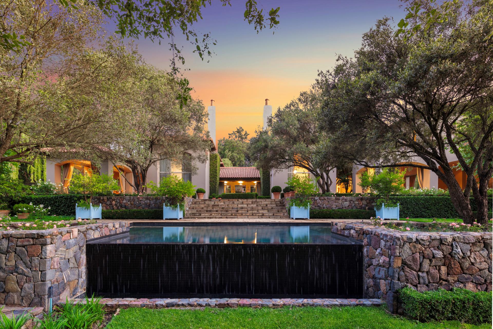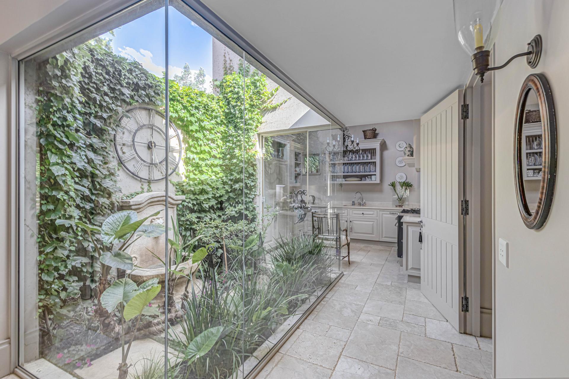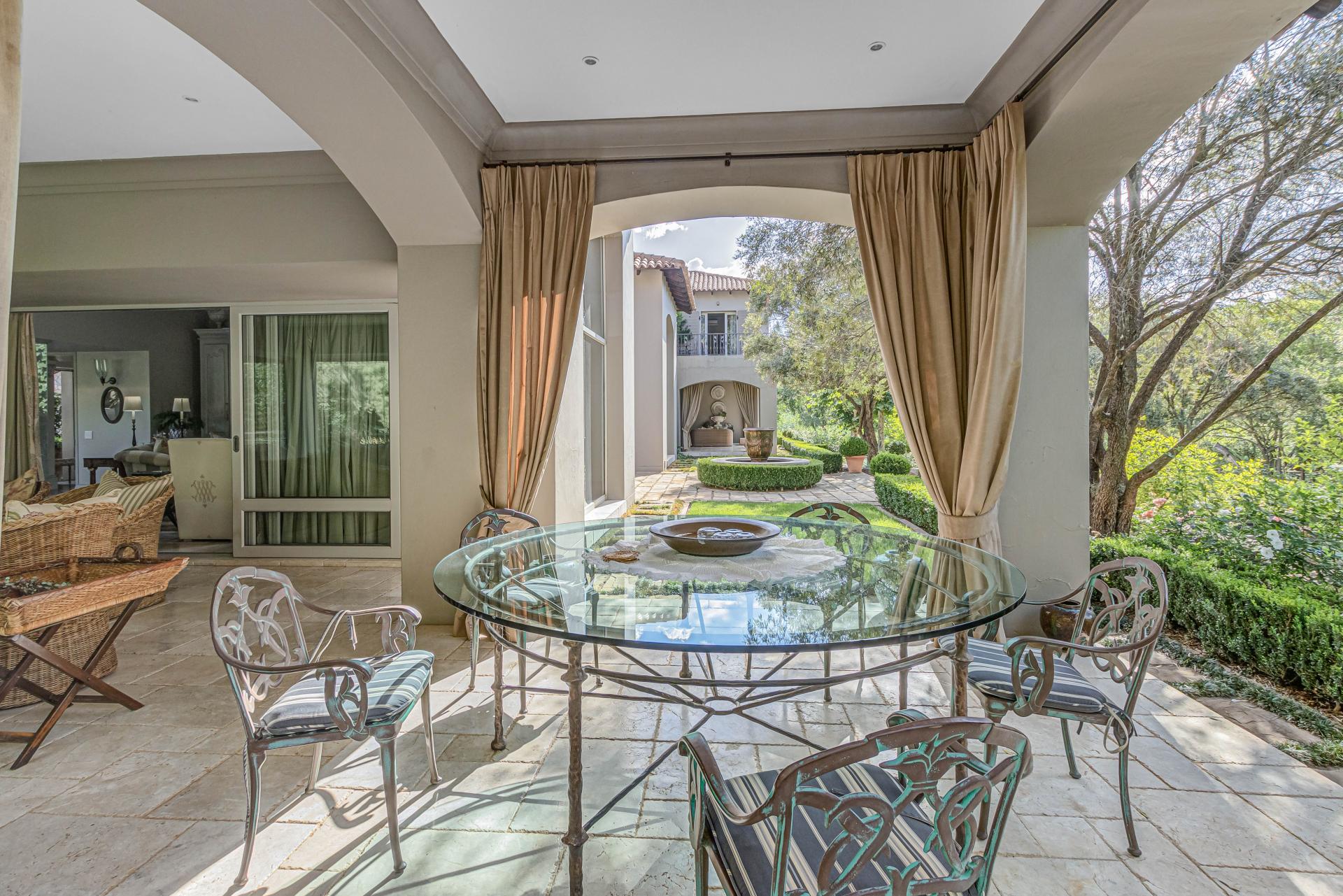 Step into this classic villa and be captivated with its beauty from the imported travertine floor tiles, roof tiles from Italy, crystal chandeliers and exterior stone brought in from India for the home. The property is split into two residences which are conveniently joined together but can be separated for complete privacy from one another. It is an ideal home for the multigenerational family where space is a requirement and multiple entertainment & relaxation areas are a must have. On one side of the property you will find three en-suite bedrooms upstairs, a grand gourmet country kitchen, beautiful central dining area, a champagne lounge and additional lounge/tv area all leading out onto the large covered patio with a built in concealed gas braai. There is a private dining room and lounge with extra high volume ceilings and a beautiful gas fire place. The kitchen leads to the brightest scullery area, which then takes you to the rose cutting/potting room with doors opening onto the stunning rose garden. This home is unique with this beautiful room which has an accent piece rose chandelier. Then walk into a beautiful laundry room which is connected to one set of three garages. The outdoor courtyards lead to the 3 bedroom cottage which can be used as staff quarters or as a separate residence all together. On the other side of the home are two beautifully sized bedrooms en suite, a large office, kitchen, atrium and very comfortable lounge/tv room leading onto its own patio and deck looking onto the garden and waterfall. This side of the home is completed with the second triple garage.