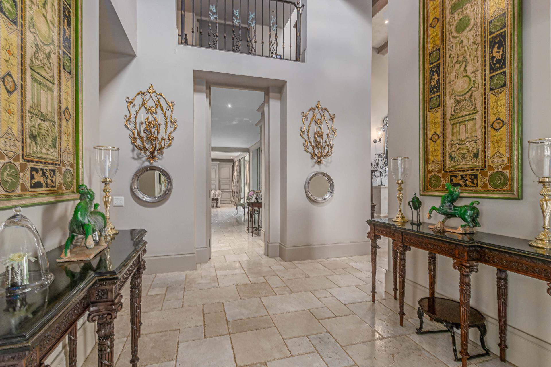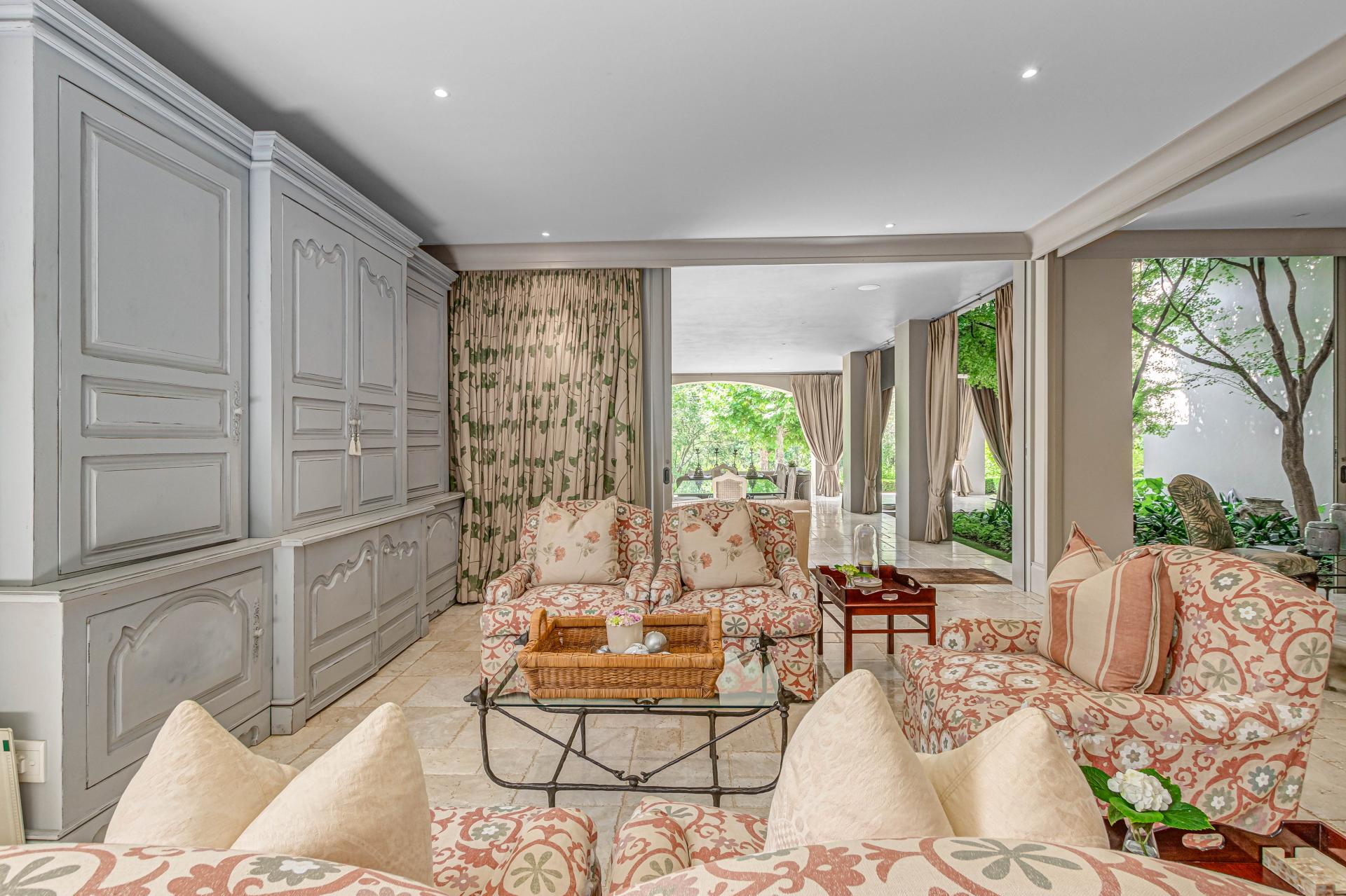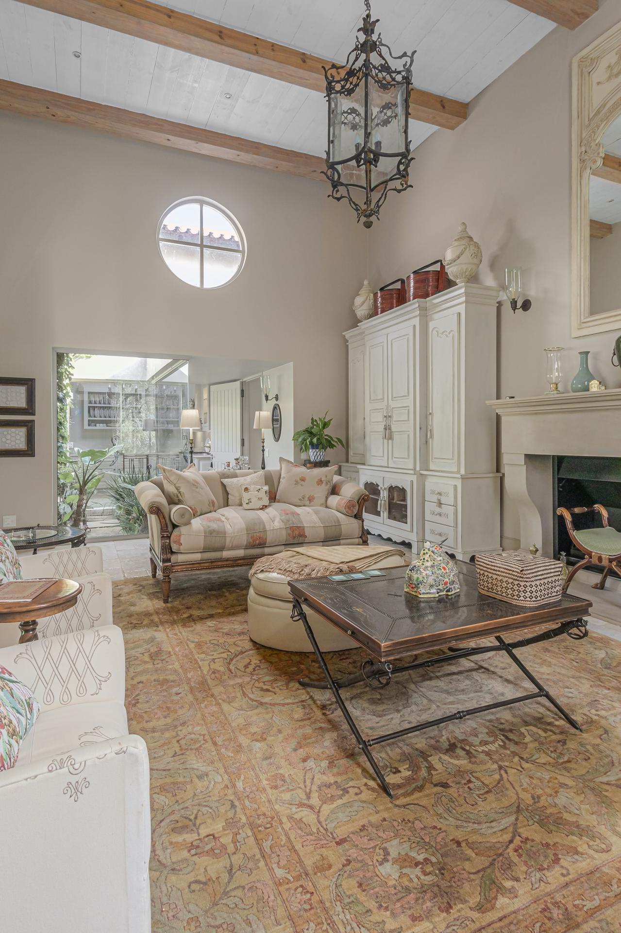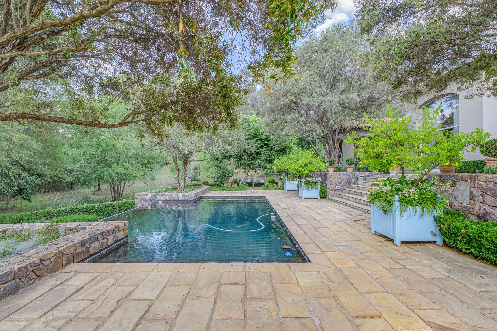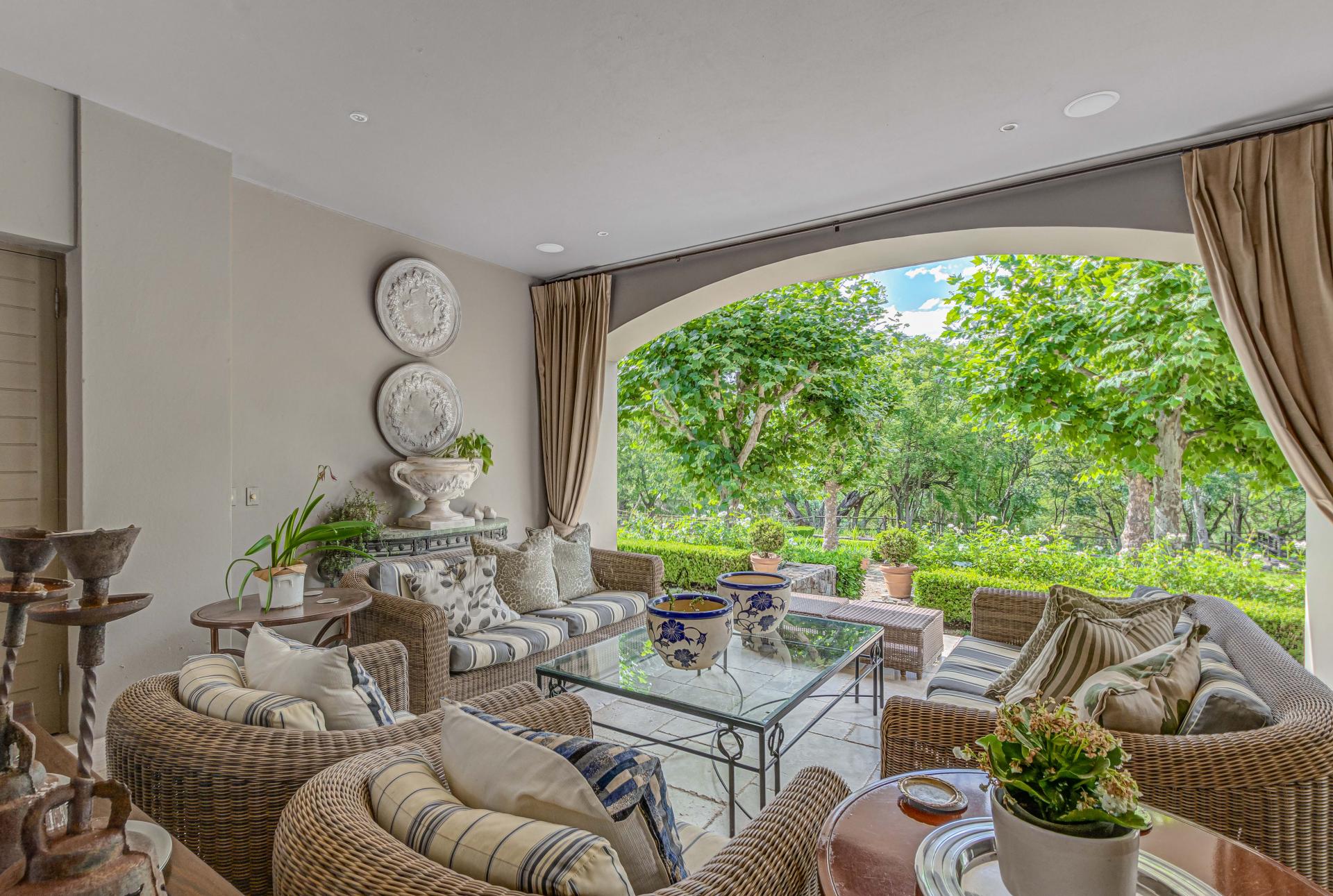 Step into this classic villa and be captivated with its beauty from the imported travertine floor tiles, roof tiles from Italy, crystal chandeliers and exterior stone brought in from India for the home. The property is split into two residences which are conveniently joined together but can be separated for complete privacy from one another. It is an ideal home for the multigenerational family where space is a requirement and multiple entertainment & relaxation areas are a must have. On one side of the property you will find three en-suite bedrooms upstairs, a grand gourmet country kitchen, beautiful central dining area, a champagne lounge and additional lounge/tv area all leading out onto the large covered patio with a built in concealed gas braai. There is a private dining room and lounge with extra high volume ceilings and a beautiful gas fire place. The kitchen leads to the brightest scullery area, which then takes you to the rose cutting/potting room with doors opening onto the stunning rose garden. This home is unique with this beautiful room which has an accent piece rose chandelier. Then walk into a beautiful laundry room which is connected to one set of three garages. The outdoor courtyards lead to the 3 bedroom cottage which can be used as staff quarters or as a separate residence all together. On the other side of the home are two beautifully sized bedrooms en suite, a large office, kitchen, atrium and very comfortable lounge/tv room leading onto its own patio and deck looking onto the garden and waterfall. This side of the home is completed with the second triple garage.