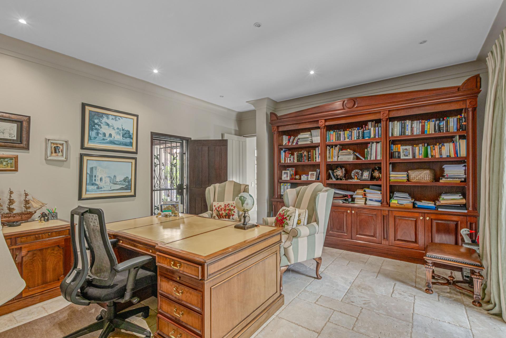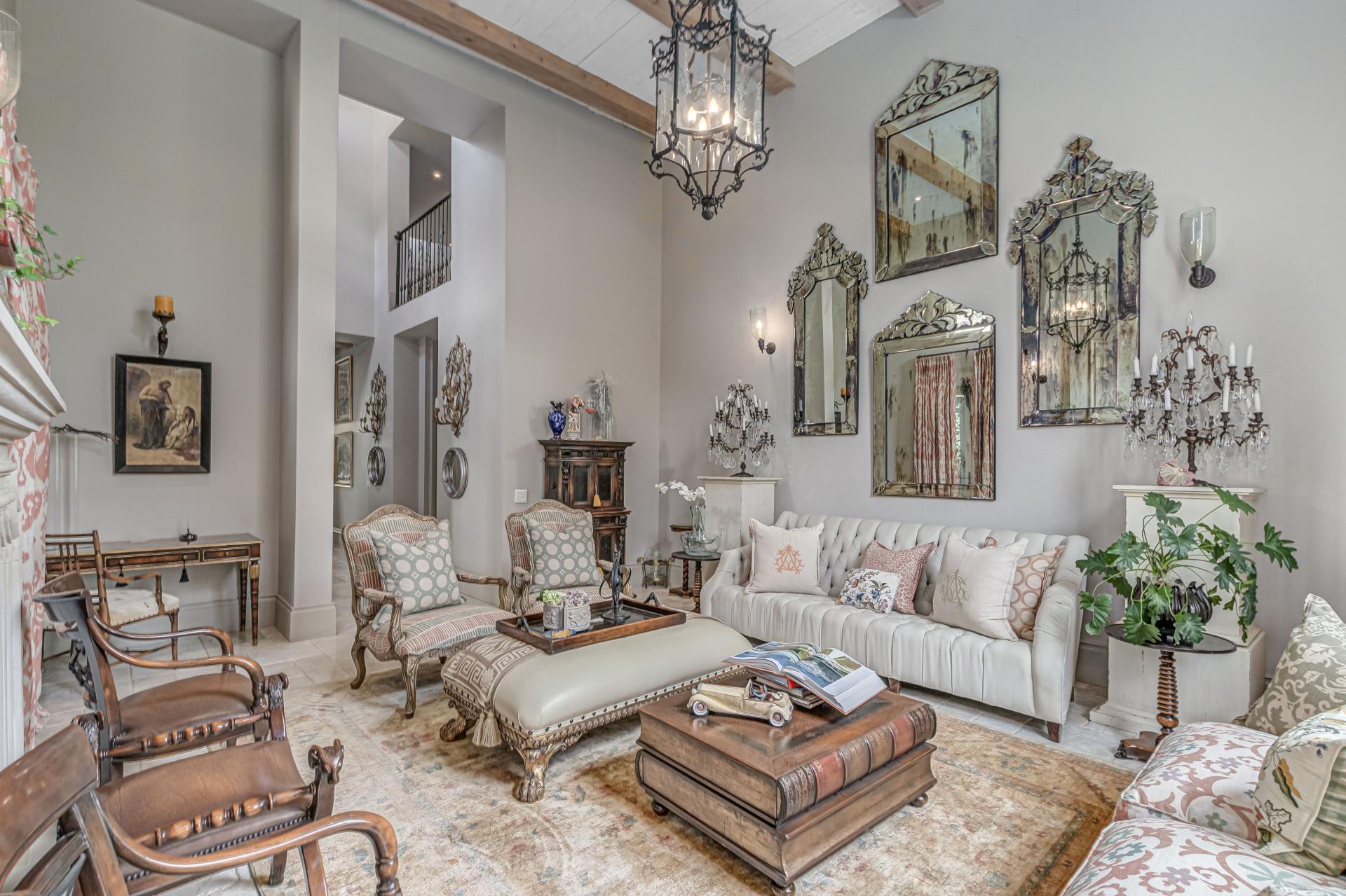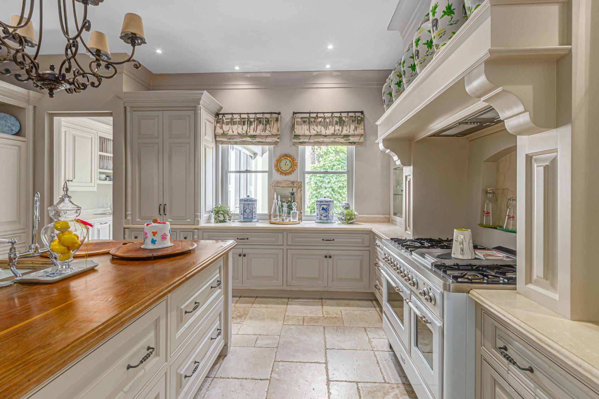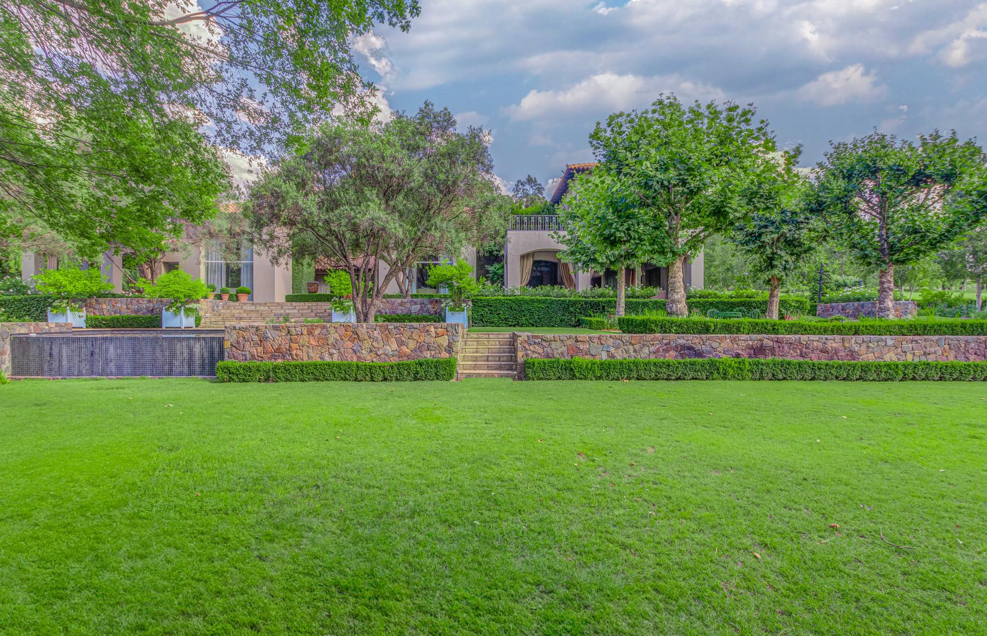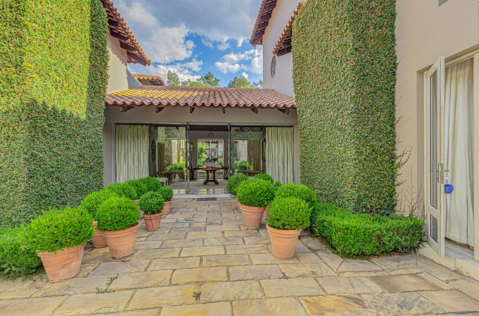 Step into this classic villa and be captivated with its beauty from the imported travertine floor tiles, roof tiles from Italy, crystal chandeliers and exterior stone brought in from India for the home. The property is split into two residences which are conveniently joined together but can be separated for complete privacy from one another. It is an ideal home for the multigenerational family where space is a requirement and multiple entertainment & relaxation areas are a must have. On one side of the property you will find three en-suite bedrooms upstairs, a grand gourmet country kitchen, beautiful central dining area, a champagne lounge and additional lounge/tv area all leading out onto the large covered patio with a built in concealed gas braai. There is a private dining room and lounge with extra high volume ceilings and a beautiful gas fire place. The kitchen leads to the brightest scullery area, which then takes you to the rose cutting/potting room with doors opening onto the stunning rose garden. This home is unique with this beautiful room which has an accent piece rose chandelier. Then walk into a beautiful laundry room which is connected to one set of three garages. The outdoor courtyards lead to the 3 bedroom cottage which can be used as staff quarters or as a separate residence all together. On the other side of the home are two beautifully sized bedrooms en suite, a large office, kitchen, atrium and very comfortable lounge/tv room leading onto its own patio and deck looking onto the garden and waterfall. This side of the home is completed with the second triple garage.