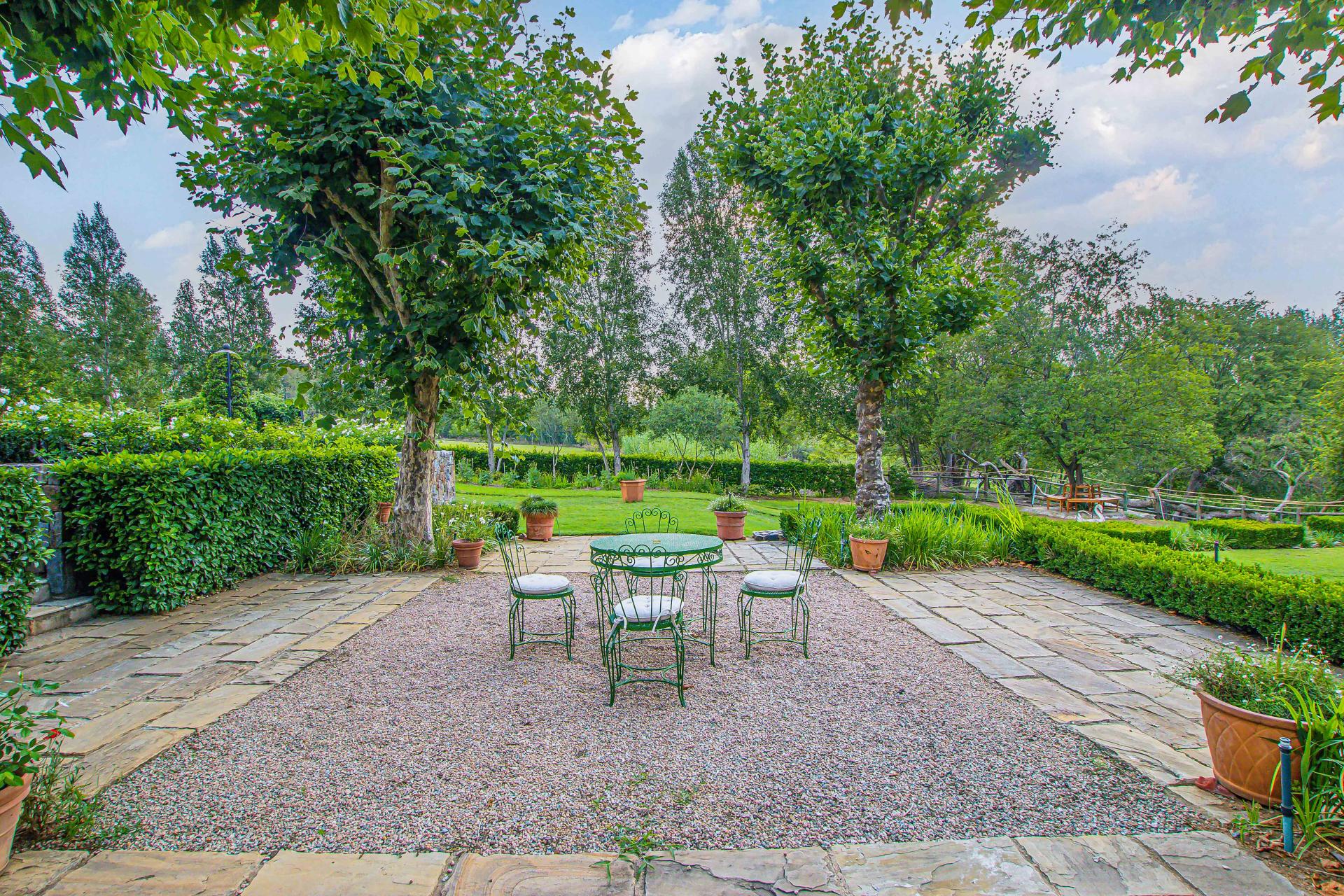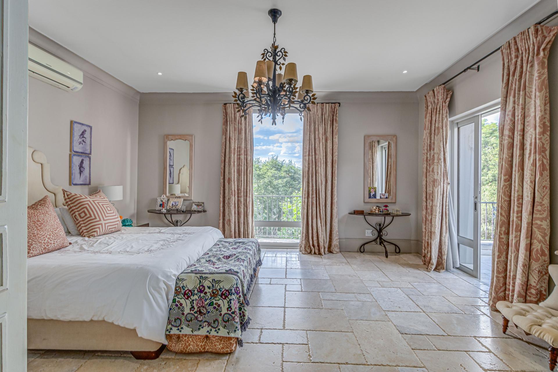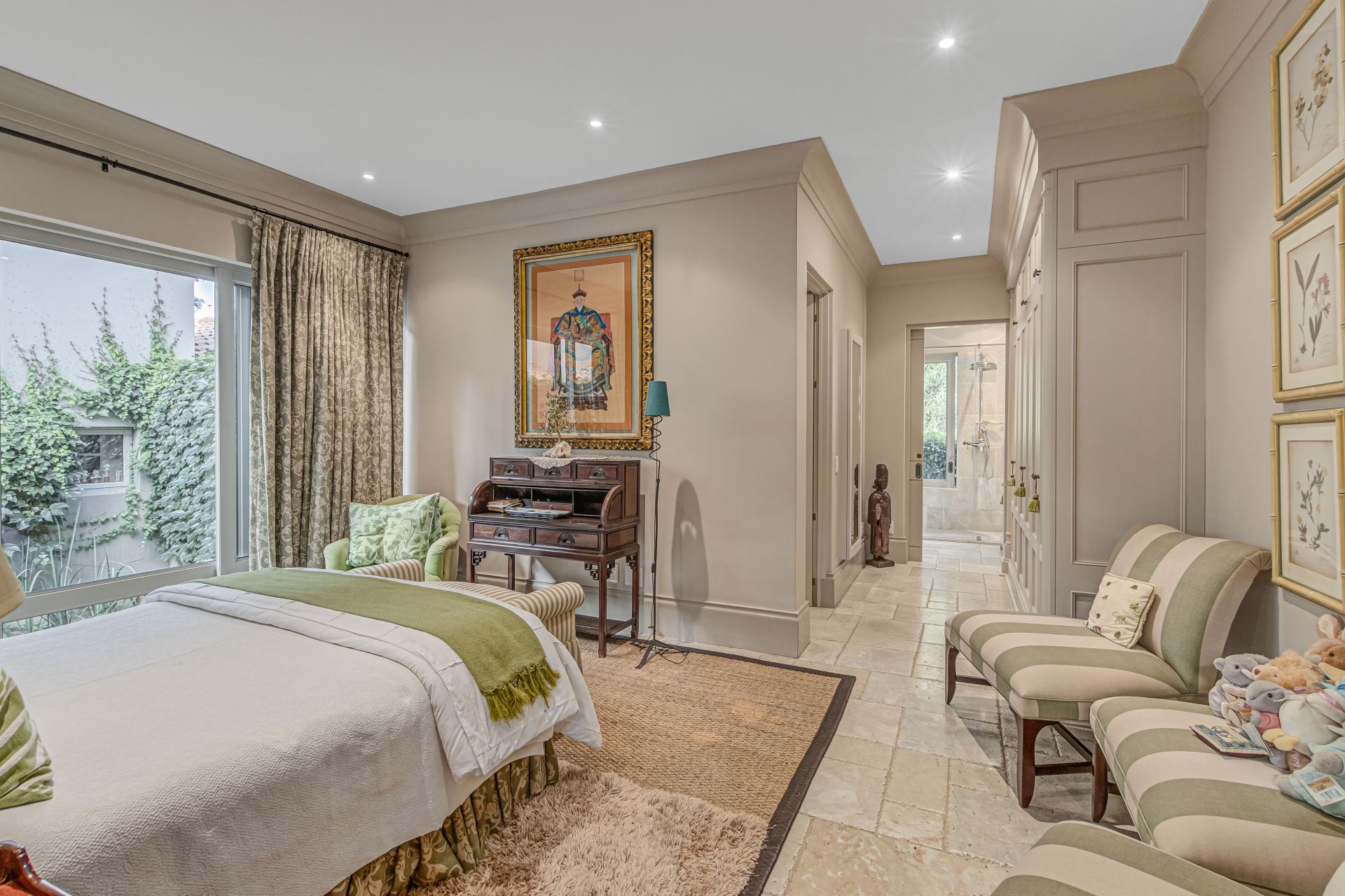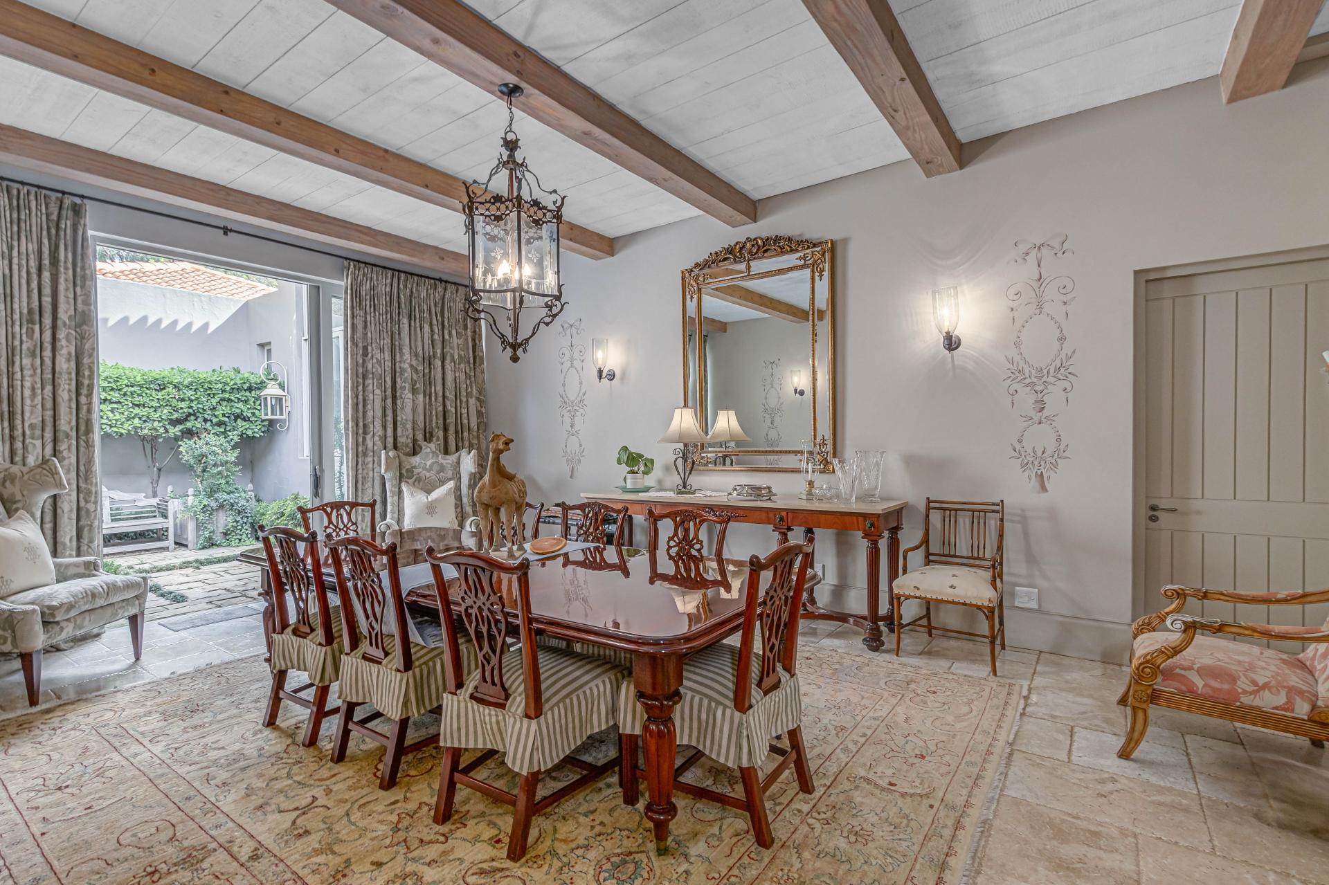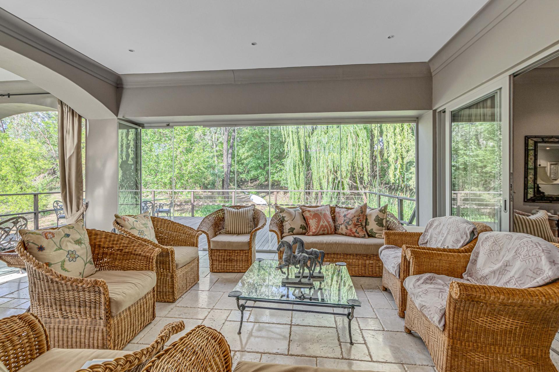 Step into this classic villa and be captivated with its beauty from the imported travertine floor tiles, roof tiles from Italy, crystal chandeliers and exterior stone brought in from India for the home. The property is split into two residences which are conveniently joined together but can be separated for complete privacy from one another. It is an ideal home for the multigenerational family where space is a requirement and multiple entertainment & relaxation areas are a must have. On one side of the property you will find three en-suite bedrooms upstairs, a grand gourmet country kitchen, beautiful central dining area, a champagne lounge and additional lounge/tv area all leading out onto the large covered patio with a built in concealed gas braai. There is a private dining room and lounge with extra high volume ceilings and a beautiful gas fire place. The kitchen leads to the brightest scullery area, which then takes you to the rose cutting/potting room with doors opening onto the stunning rose garden. This home is unique with this beautiful room which has an accent piece rose chandelier. Then walk into a beautiful laundry room which is connected to one set of three garages. The outdoor courtyards lead to the 3 bedroom cottage which can be used as staff quarters or as a separate residence all together. On the other side of the home are two beautifully sized bedrooms en suite, a large office, kitchen, atrium and very comfortable lounge/tv room leading onto its own patio and deck looking onto the garden and waterfall. This side of the home is completed with the second triple garage.