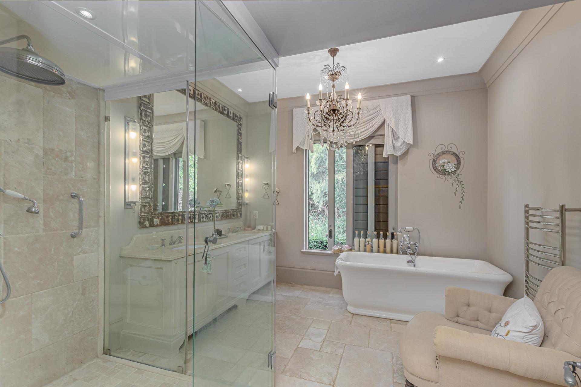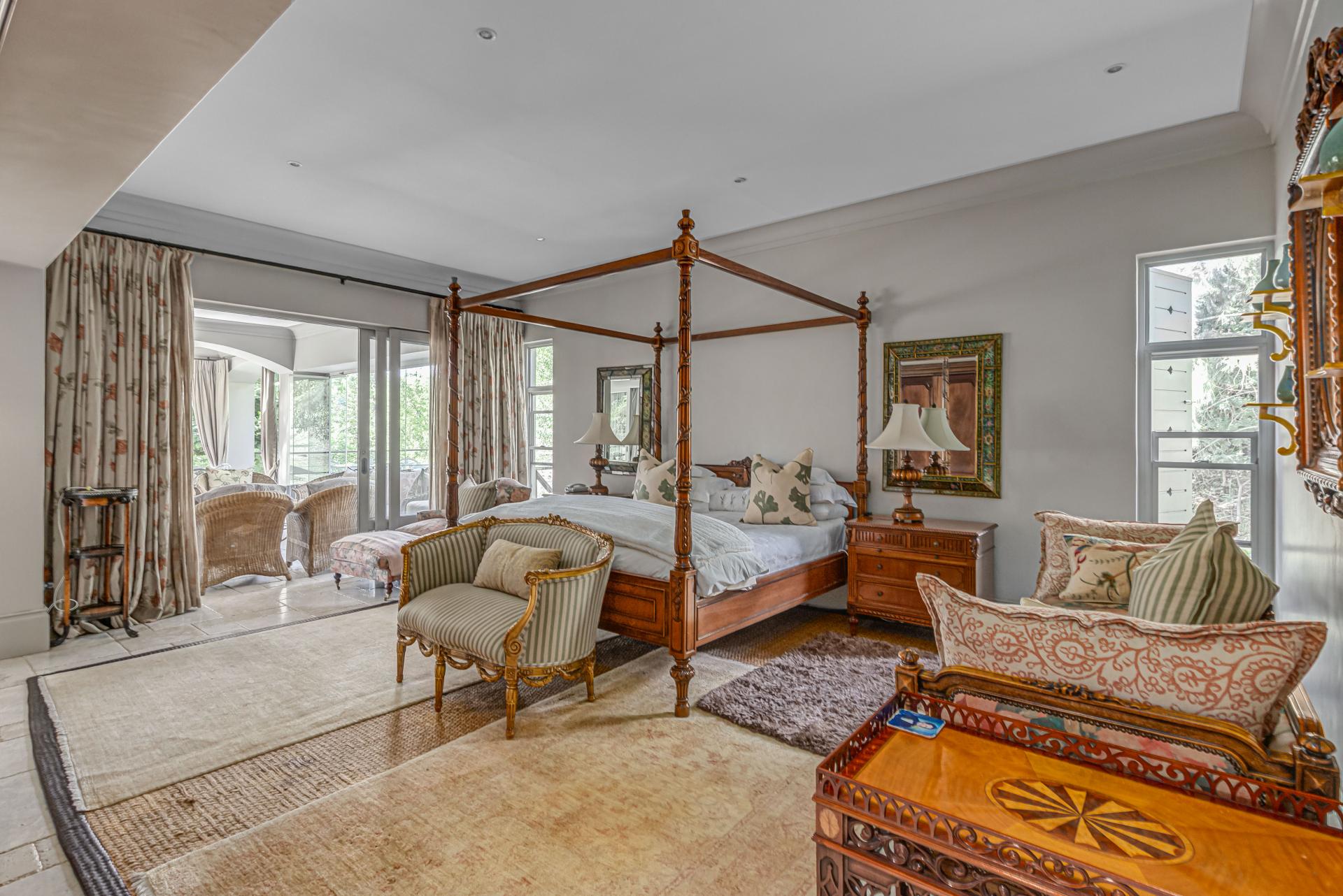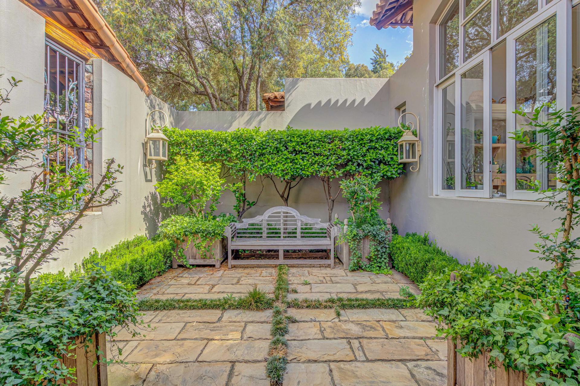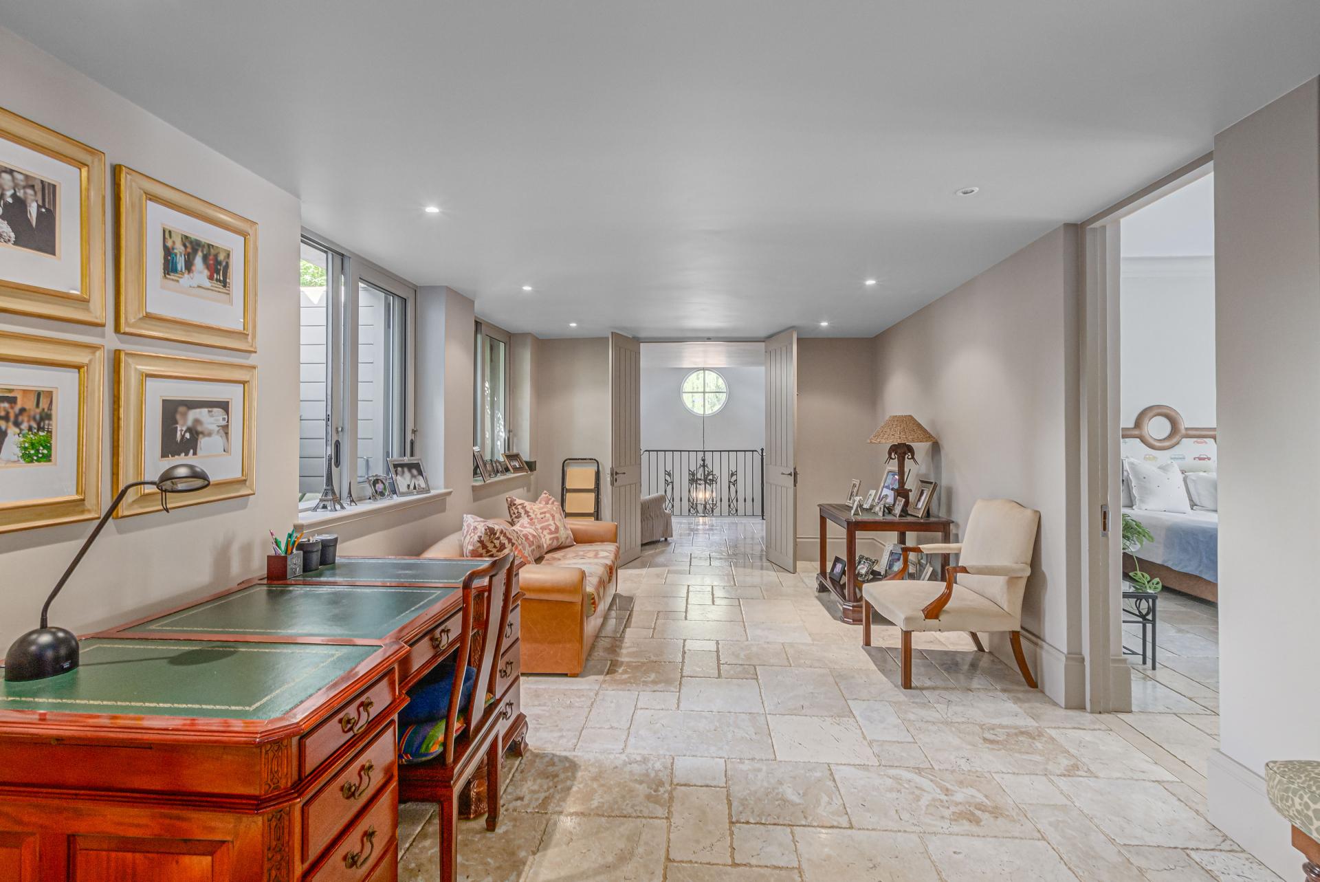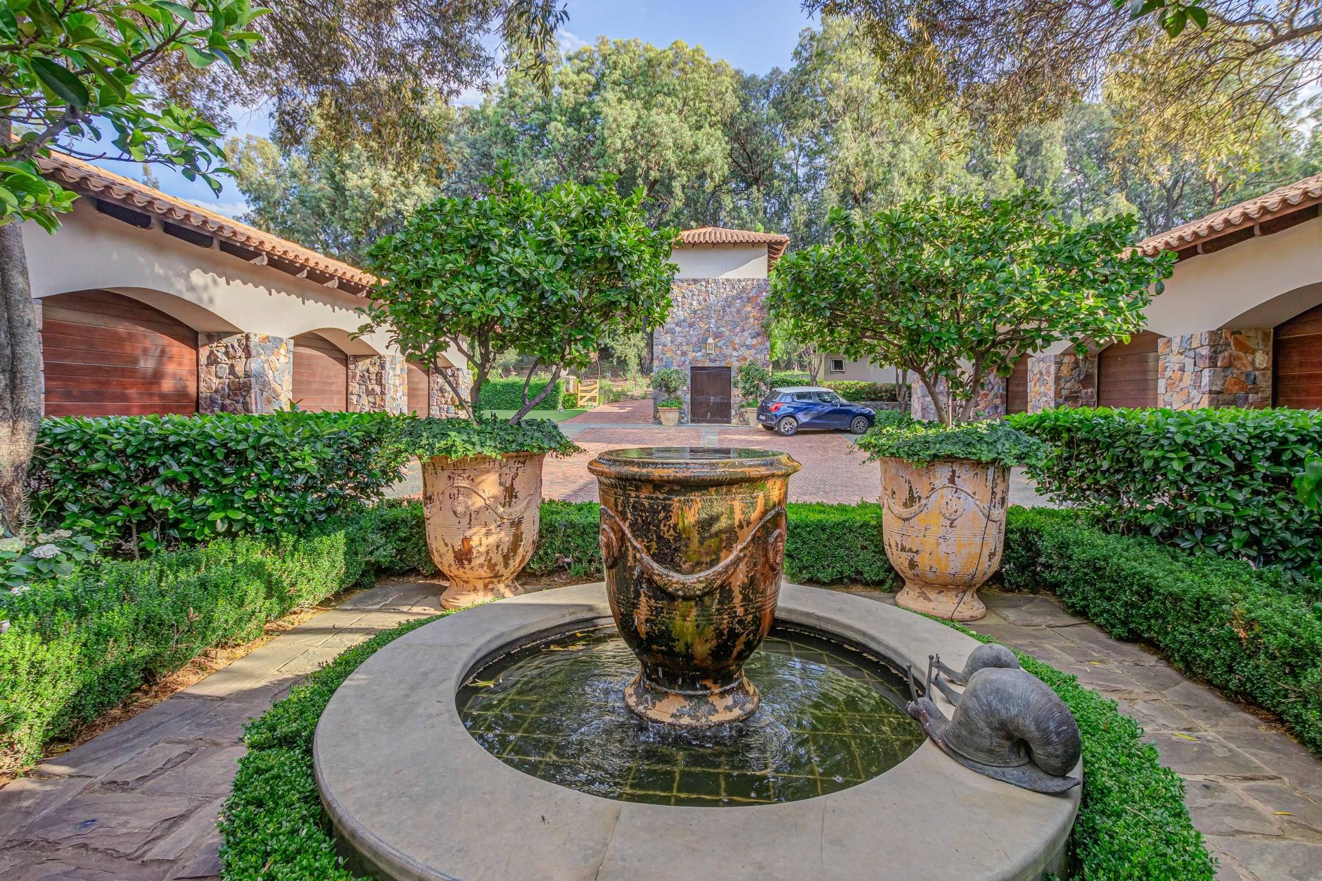 Step into this classic villa and be captivated with its beauty from the imported travertine floor tiles, roof tiles from Italy, crystal chandeliers and exterior stone brought in from India for the home. The property is split into two residences which are conveniently joined together but can be separated for complete privacy from one another. It is an ideal home for the multigenerational family where space is a requirement and multiple entertainment & relaxation areas are a must have. On one side of the property you will find three en-suite bedrooms upstairs, a grand gourmet country kitchen, beautiful central dining area, a champagne lounge and additional lounge/tv area all leading out onto the large covered patio with a built in concealed gas braai. There is a private dining room and lounge with extra high volume ceilings and a beautiful gas fire place. The kitchen leads to the brightest scullery area, which then takes you to the rose cutting/potting room with doors opening onto the stunning rose garden. This home is unique with this beautiful room which has an accent piece rose chandelier. Then walk into a beautiful laundry room which is connected to one set of three garages. The outdoor courtyards lead to the 3 bedroom cottage which can be used as staff quarters or as a separate residence all together. On the other side of the home are two beautifully sized bedrooms en suite, a large office, kitchen, atrium and very comfortable lounge/tv room leading onto its own patio and deck looking onto the garden and waterfall. This side of the home is completed with the second triple garage.
