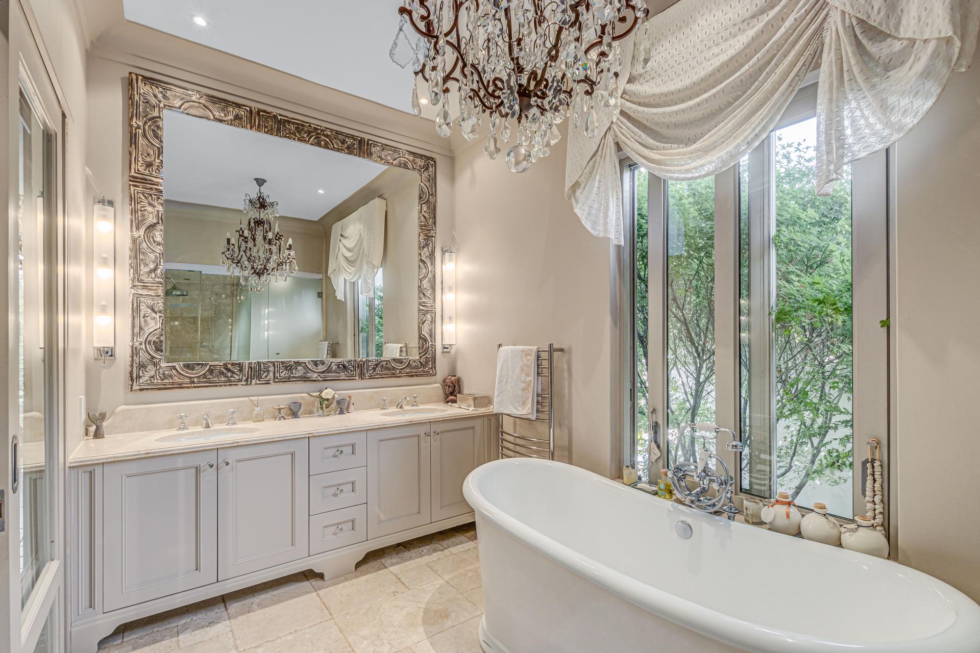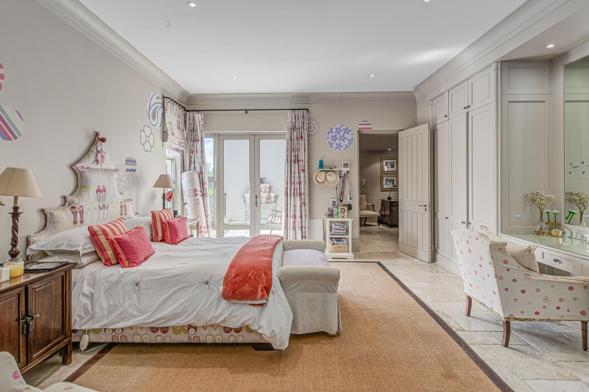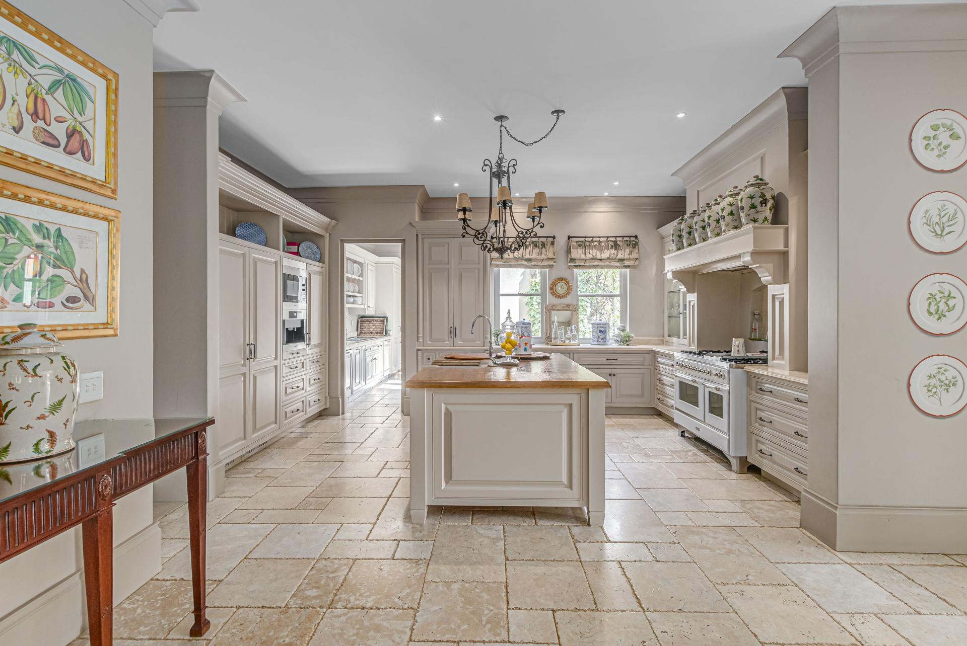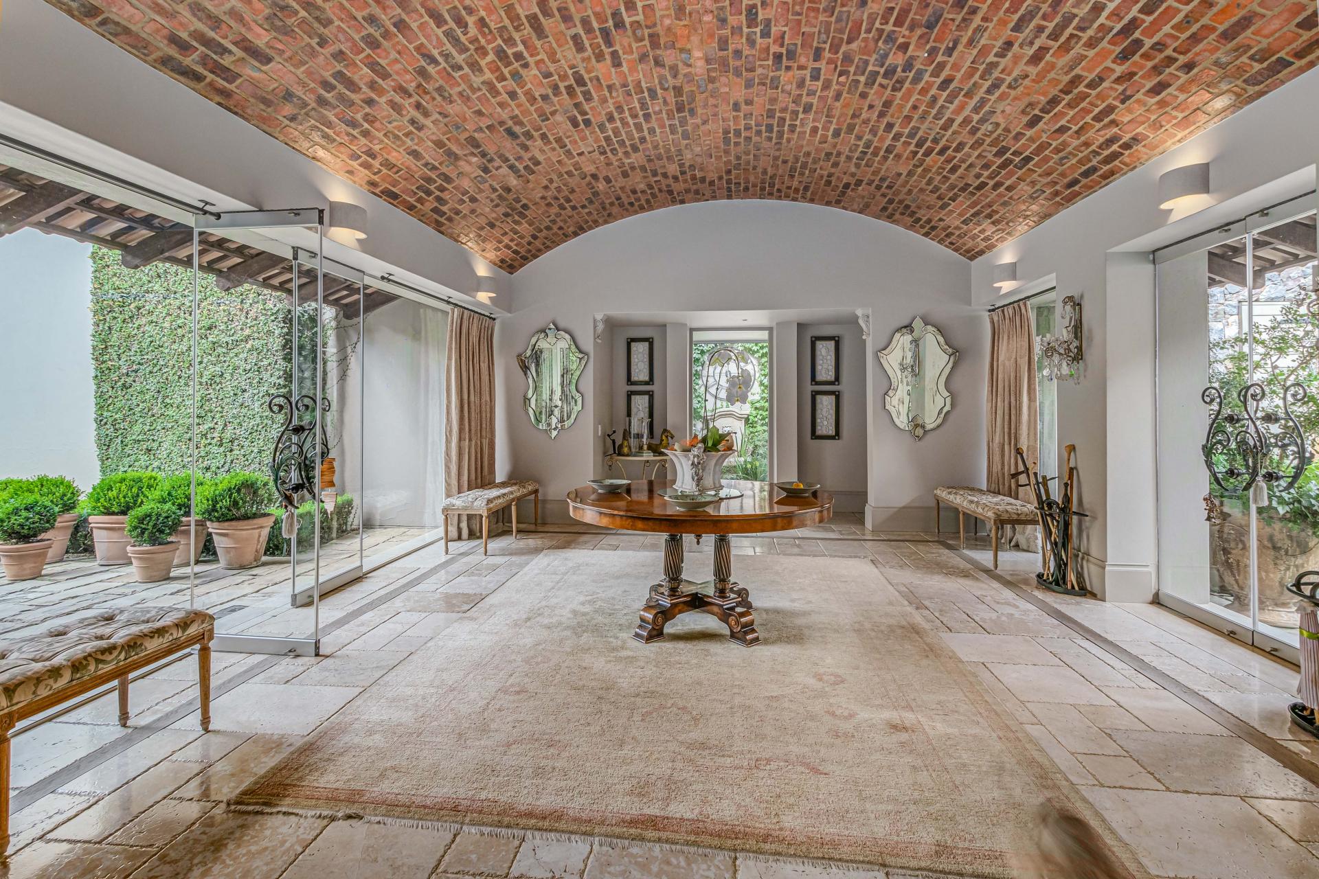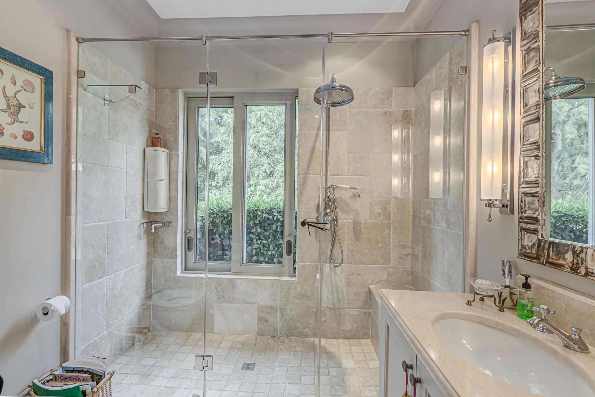 Step into this classic villa and be captivated with its beauty from the imported travertine floor tiles, roof tiles from Italy, crystal chandeliers and exterior stone brought in from India for the home. The property is split into two residences which are conveniently joined together but can be separated for complete privacy from one another. It is an ideal home for the multigenerational family where space is a requirement and multiple entertainment & relaxation areas are a must have. On one side of the property you will find three en-suite bedrooms upstairs, a grand gourmet country kitchen, beautiful central dining area, a champagne lounge and additional lounge/tv area all leading out onto the large covered patio with a built in concealed gas braai. There is a private dining room and lounge with extra high volume ceilings and a beautiful gas fire place. The kitchen leads to the brightest scullery area, which then takes you to the rose cutting/potting room with doors opening onto the stunning rose garden. This home is unique with this beautiful room which has an accent piece rose chandelier. Then walk into a beautiful laundry room which is connected to one set of three garages. The outdoor courtyards lead to the 3 bedroom cottage which can be used as staff quarters or as a separate residence all together. On the other side of the home are two beautifully sized bedrooms en suite, a large office, kitchen, atrium and very comfortable lounge/tv room leading onto its own patio and deck looking onto the garden and waterfall. This side of the home is completed with the second triple garage.
