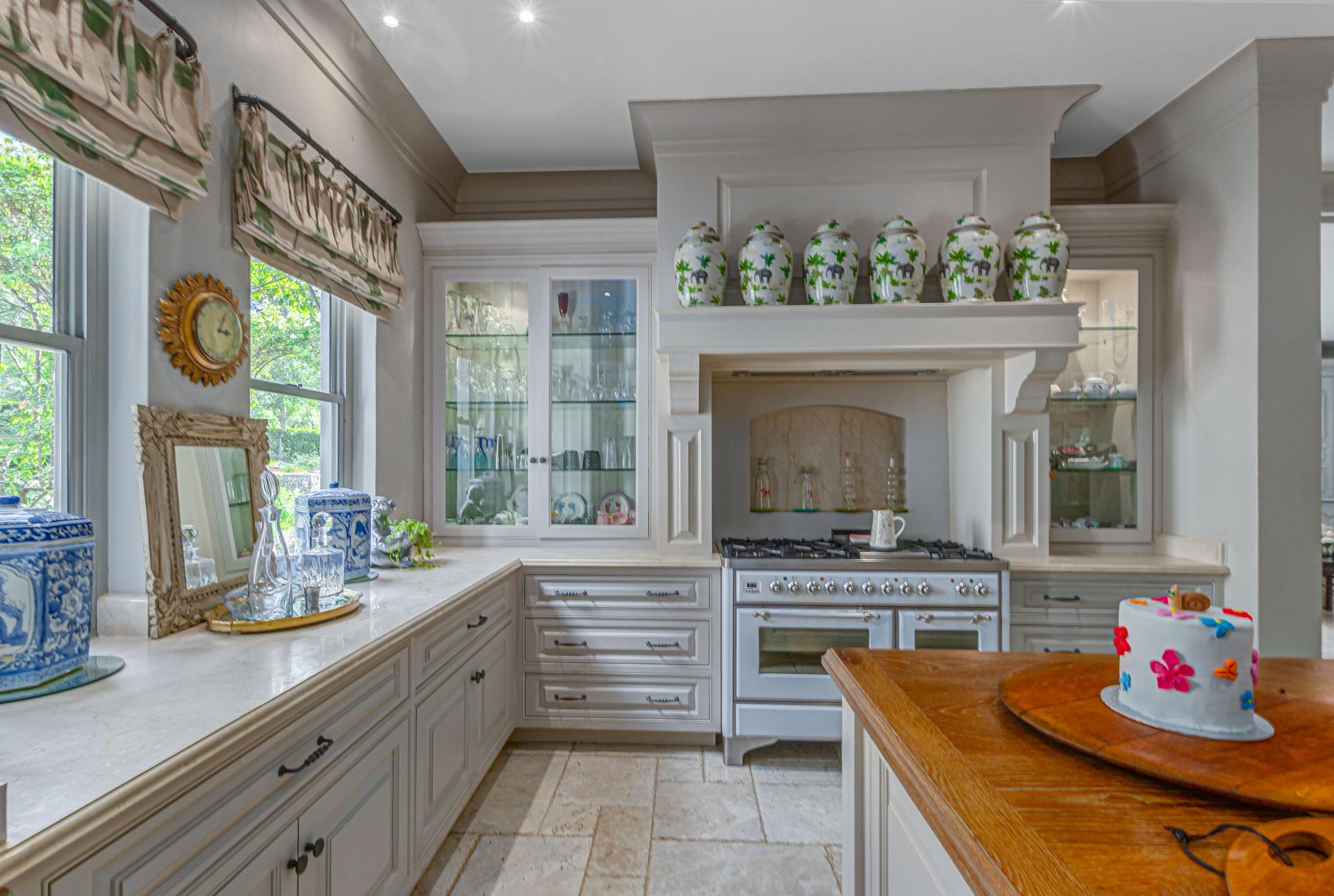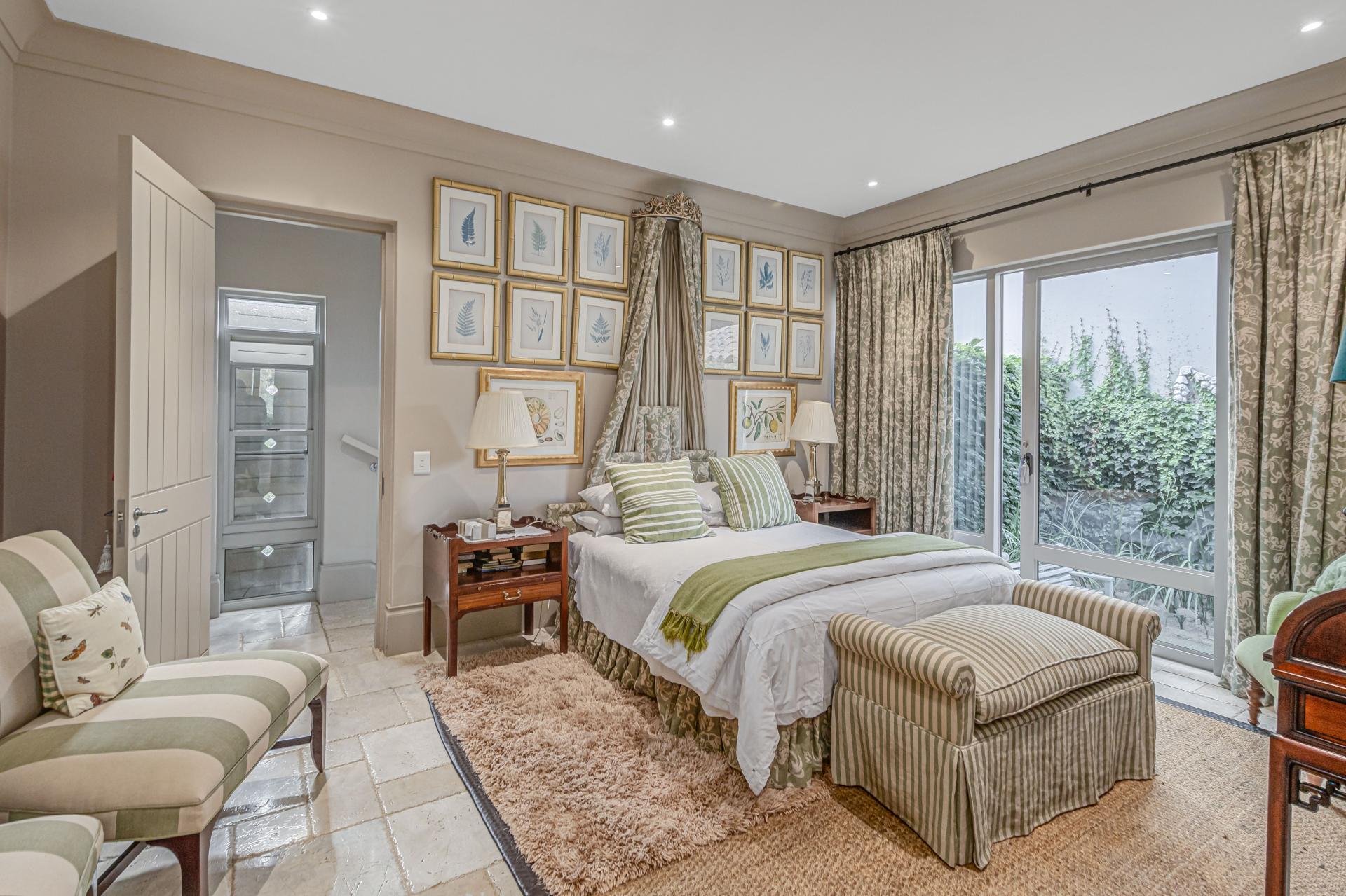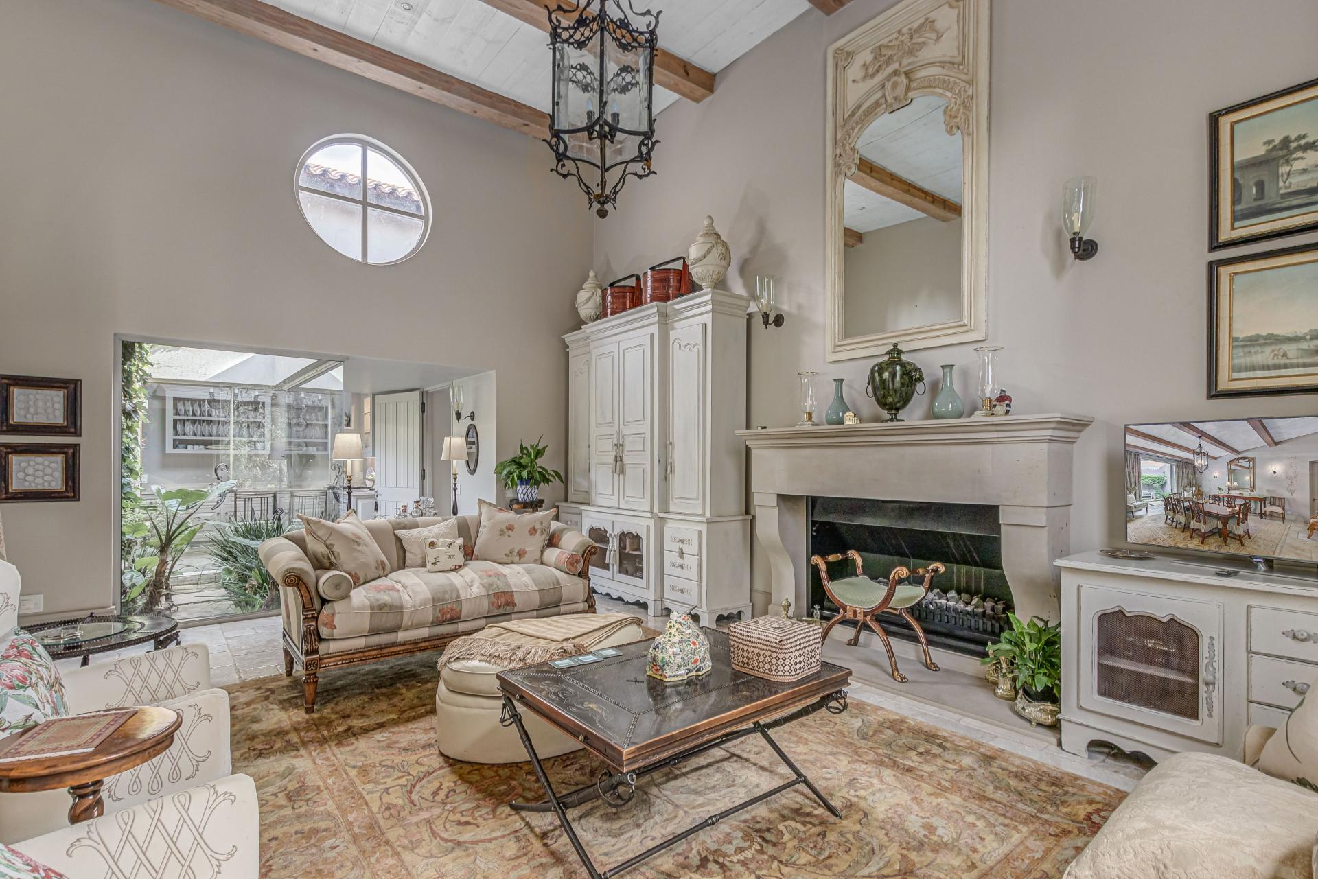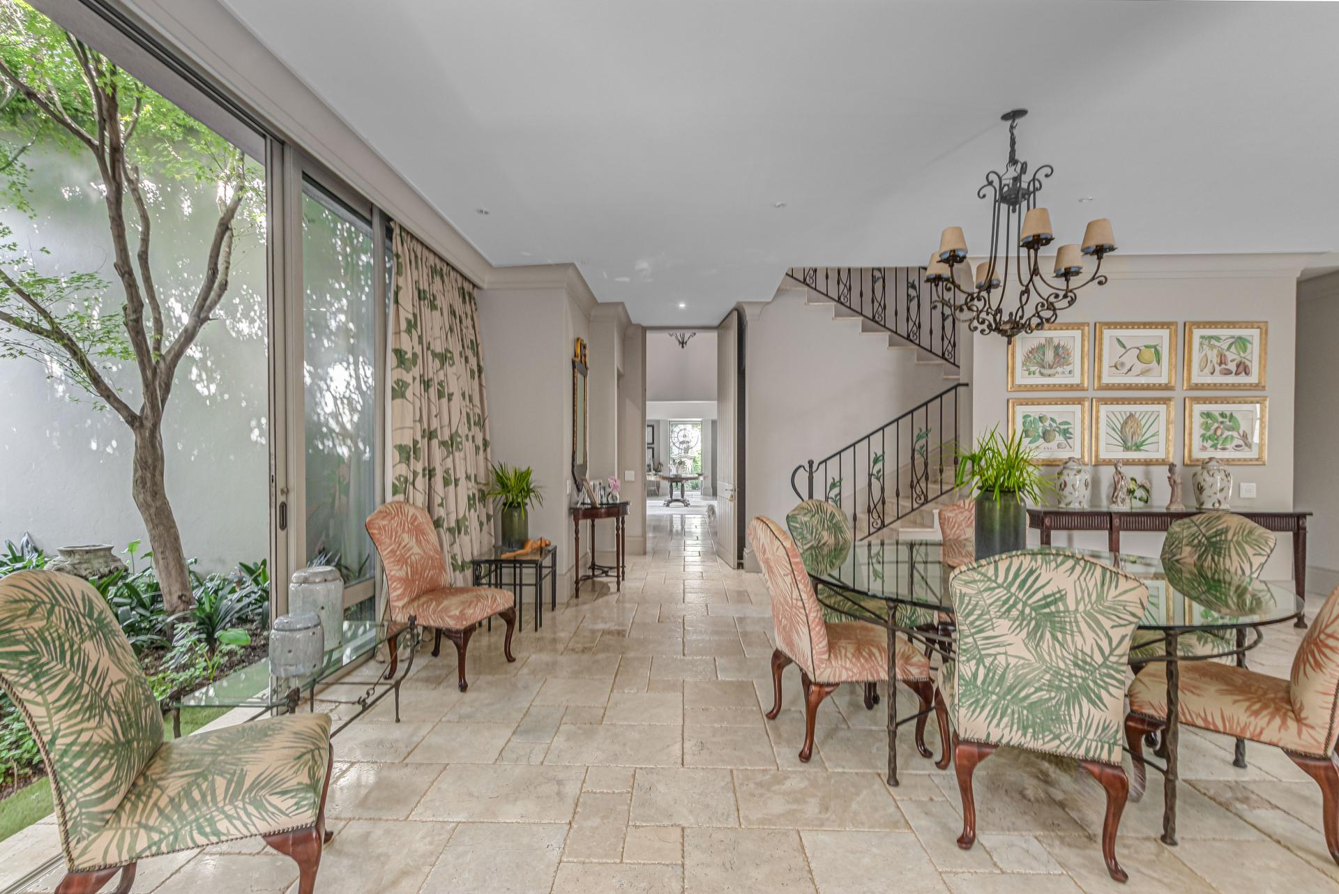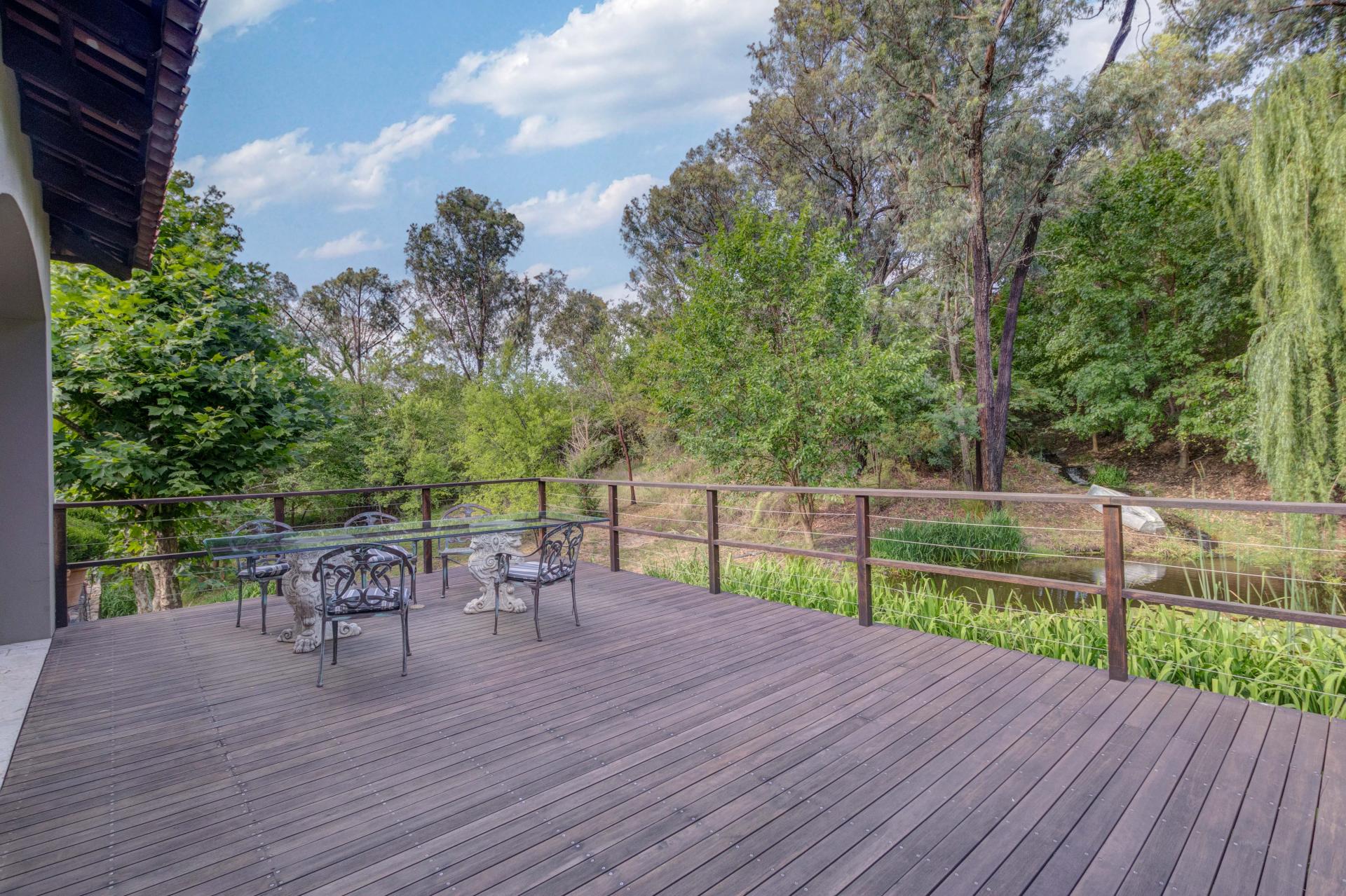 Step into this classic villa and be captivated with its beauty from the imported travertine floor tiles, roof tiles from Italy, crystal chandeliers and exterior stone brought in from India for the home. The property is split into two residences which are conveniently joined together but can be separated for complete privacy from one another. It is an ideal home for the multigenerational family where space is a requirement and multiple entertainment & relaxation areas are a must have. On one side of the property you will find three en-suite bedrooms upstairs, a grand gourmet country kitchen, beautiful central dining area, a champagne lounge and additional lounge/tv area all leading out onto the large covered patio with a built in concealed gas braai. There is a private dining room and lounge with extra high volume ceilings and a beautiful gas fire place. The kitchen leads to the brightest scullery area, which then takes you to the rose cutting/potting room with doors opening onto the stunning rose garden. This home is unique with this beautiful room which has an accent piece rose chandelier. Then walk into a beautiful laundry room which is connected to one set of three garages. The outdoor courtyards lead to the 3 bedroom cottage which can be used as staff quarters or as a separate residence all together. On the other side of the home are two beautifully sized bedrooms en suite, a large office, kitchen, atrium and very comfortable lounge/tv room leading onto its own patio and deck looking onto the garden and waterfall. This side of the home is completed with the second triple garage.