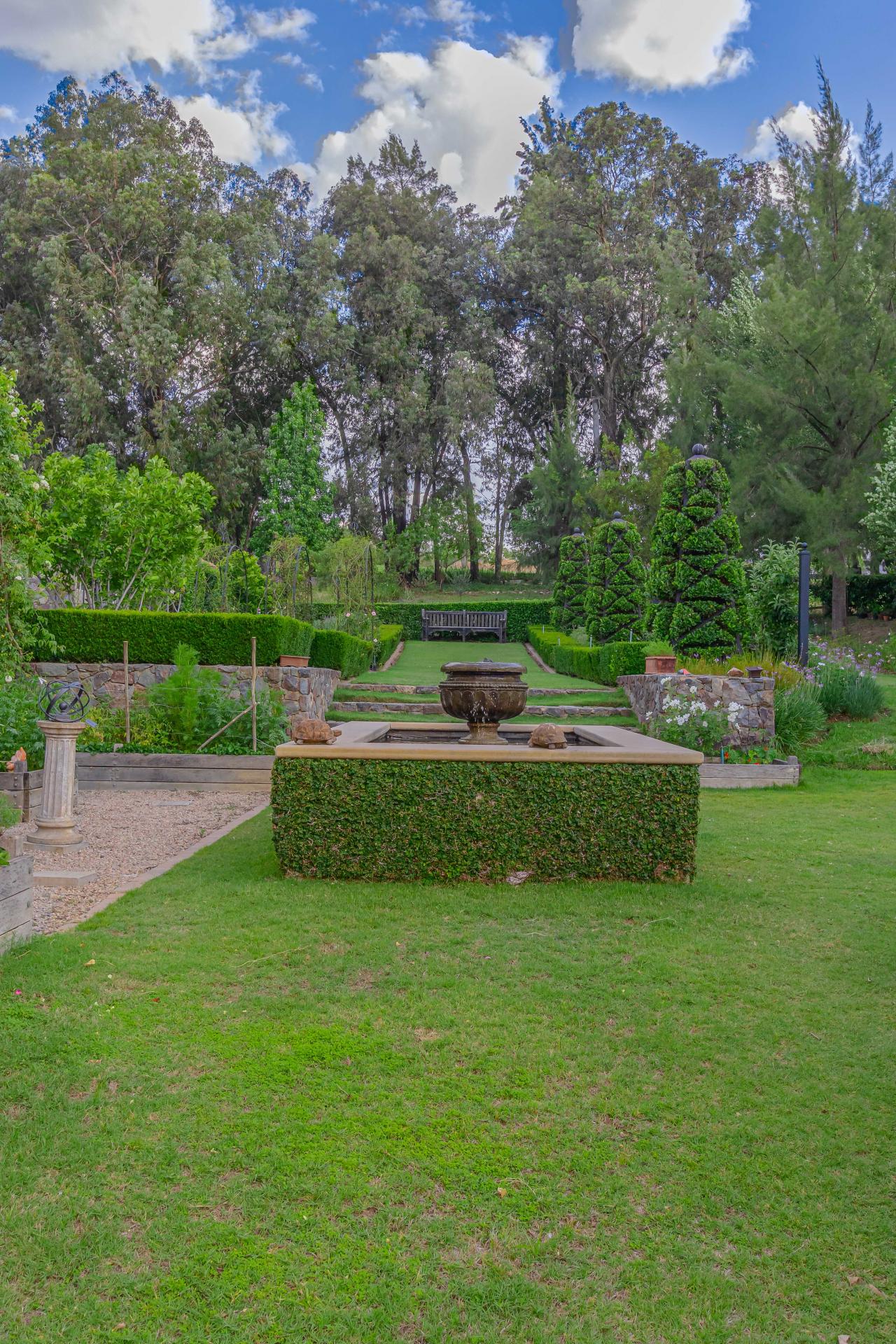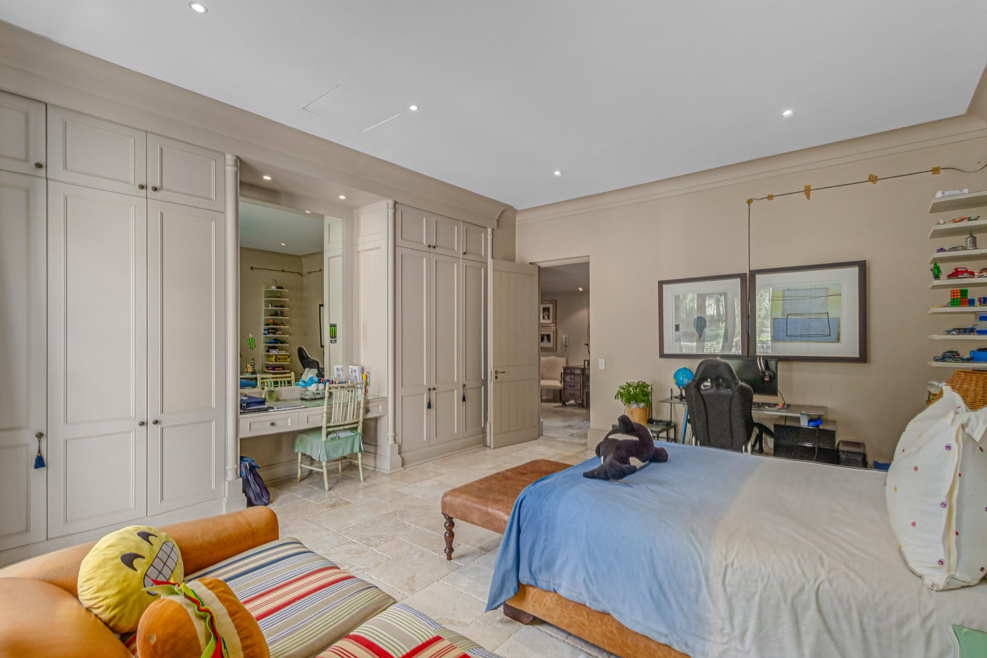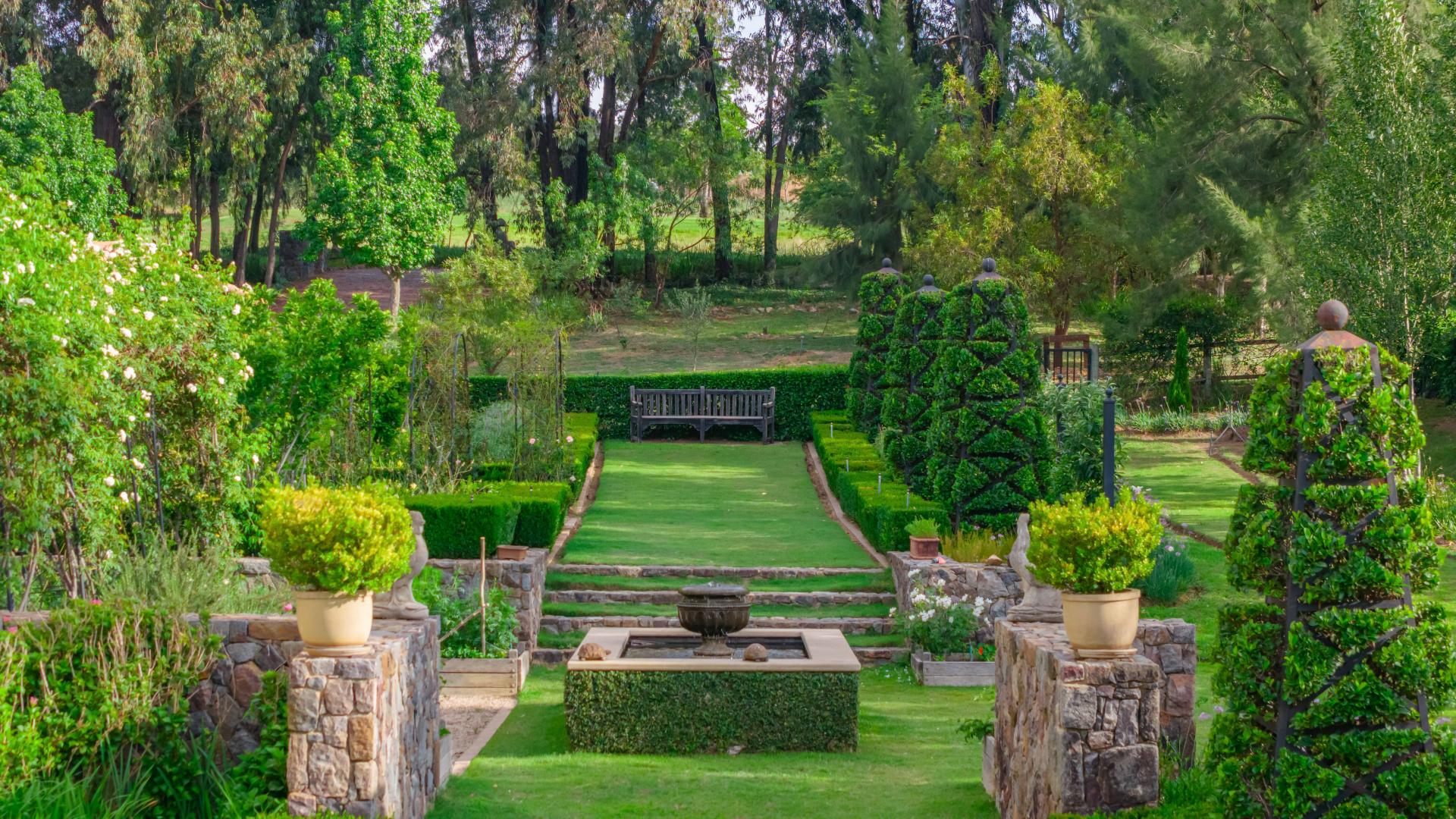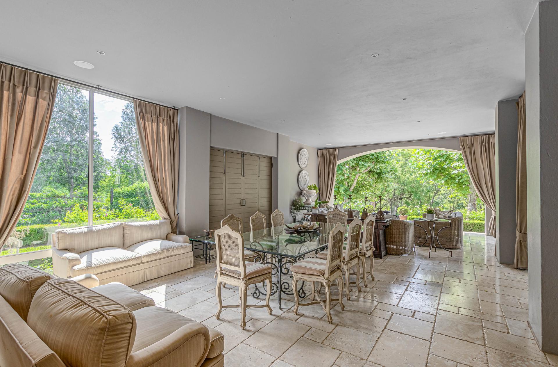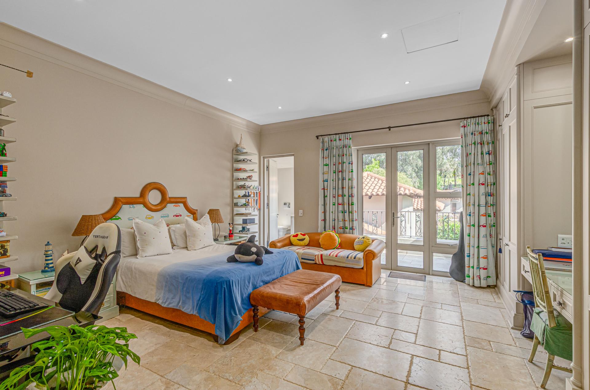 Step into this classic villa and be captivated with its beauty from the imported travertine floor tiles, roof tiles from Italy, crystal chandeliers and exterior stone brought in from India for the home. The property is split into two residences which are conveniently joined together but can be separated for complete privacy from one another. It is an ideal home for the multigenerational family where space is a requirement and multiple entertainment & relaxation areas are a must have. On one side of the property you will find three en-suite bedrooms upstairs, a grand gourmet country kitchen, beautiful central dining area, a champagne lounge and additional lounge/tv area all leading out onto the large covered patio with a built in concealed gas braai. There is a private dining room and lounge with extra high volume ceilings and a beautiful gas fire place. The kitchen leads to the brightest scullery area, which then takes you to the rose cutting/potting room with doors opening onto the stunning rose garden. This home is unique with this beautiful room which has an accent piece rose chandelier. Then walk into a beautiful laundry room which is connected to one set of three garages. The outdoor courtyards lead to the 3 bedroom cottage which can be used as staff quarters or as a separate residence all together. On the other side of the home are two beautifully sized bedrooms en suite, a large office, kitchen, atrium and very comfortable lounge/tv room leading onto its own patio and deck looking onto the garden and waterfall. This side of the home is completed with the second triple garage.