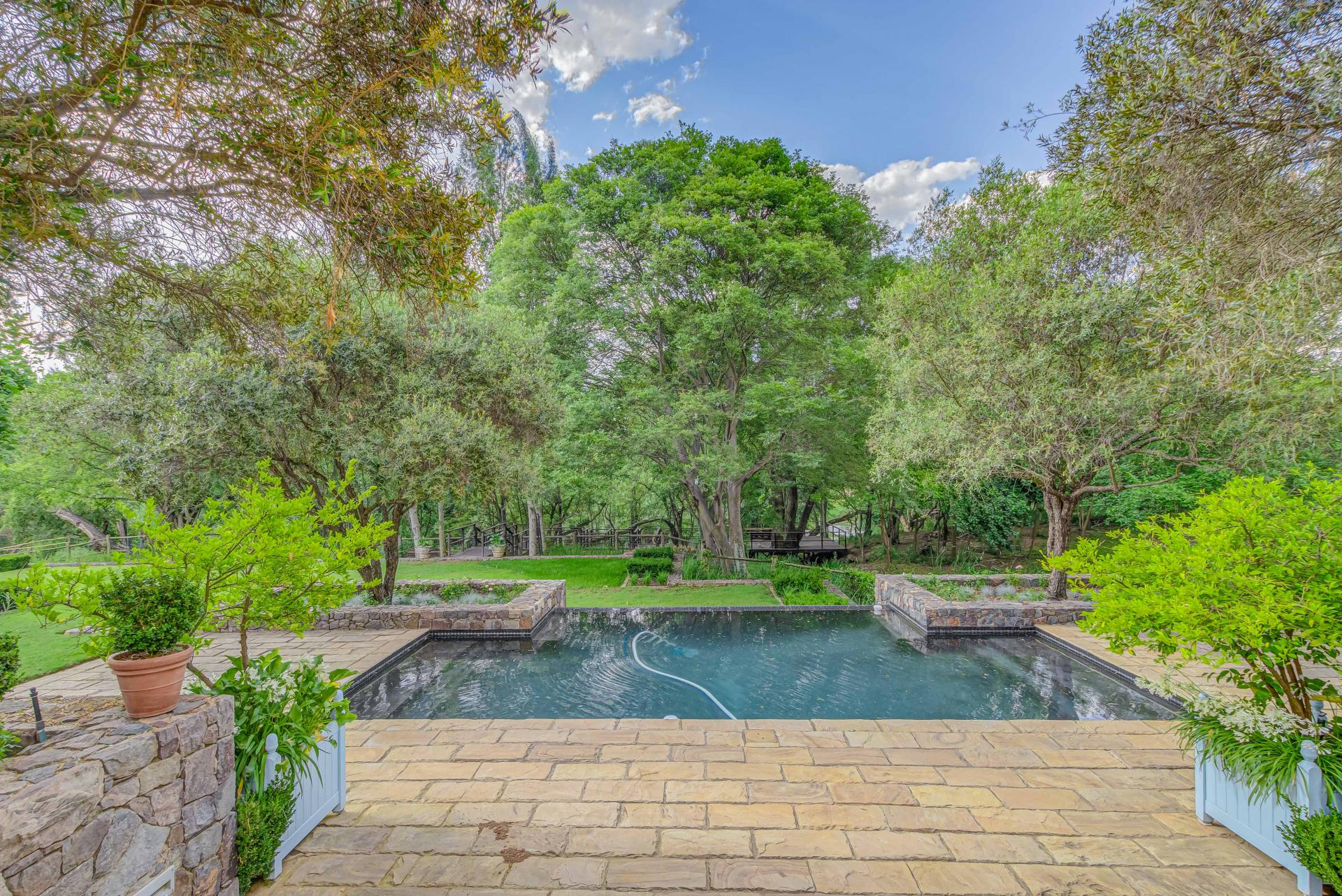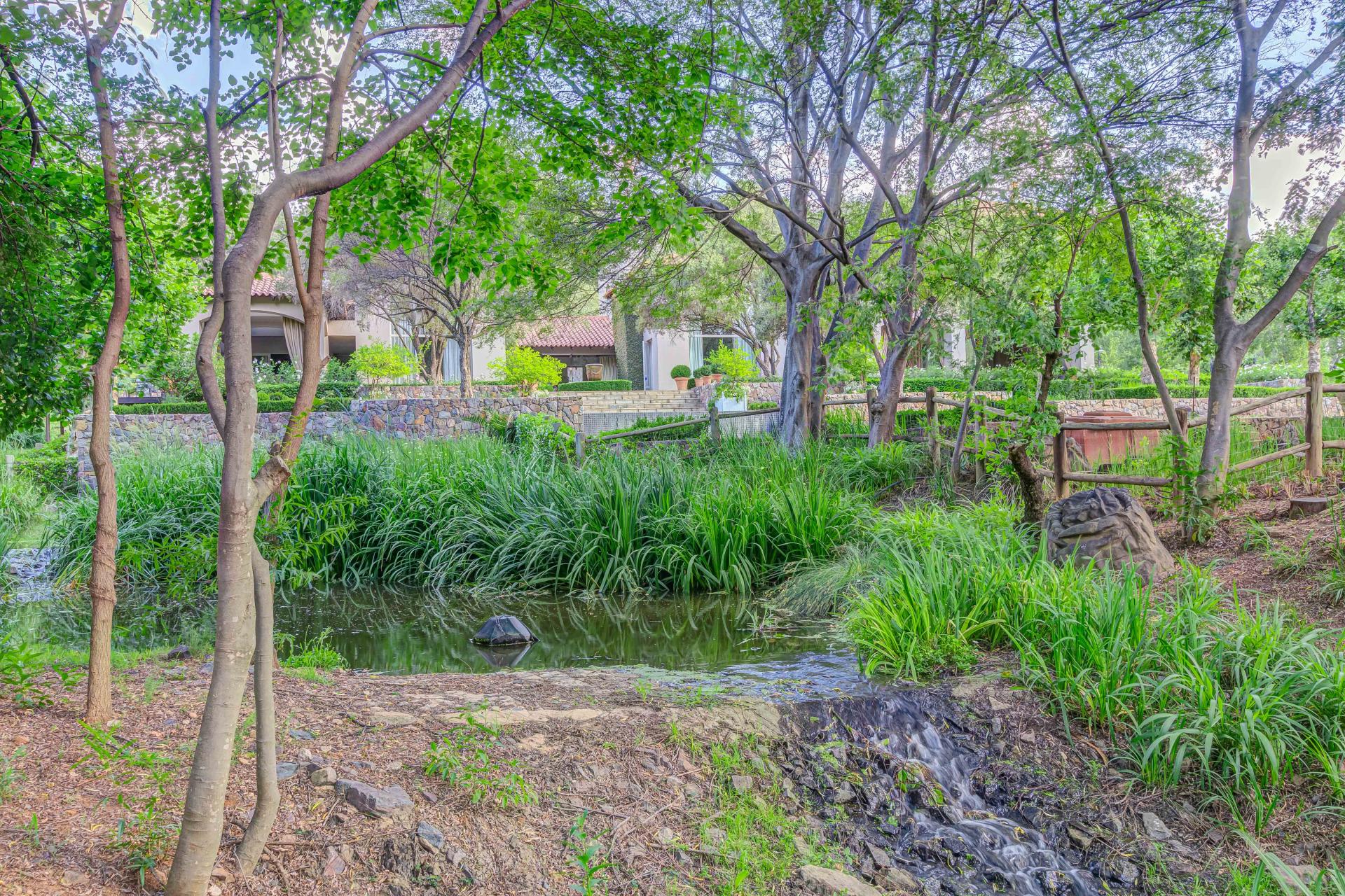 Welcome to one of Blair Atholl’s best kept secrets in the most exquisite riverfront location with a flowing waterfall on the property – one of a kind in the estate! The 1200sqm home was designed by Louis Louw and Johan Bergenthuin, decorated by the famous Stephen Falck and the extensive garden was landscaped by well known Jan Blom.