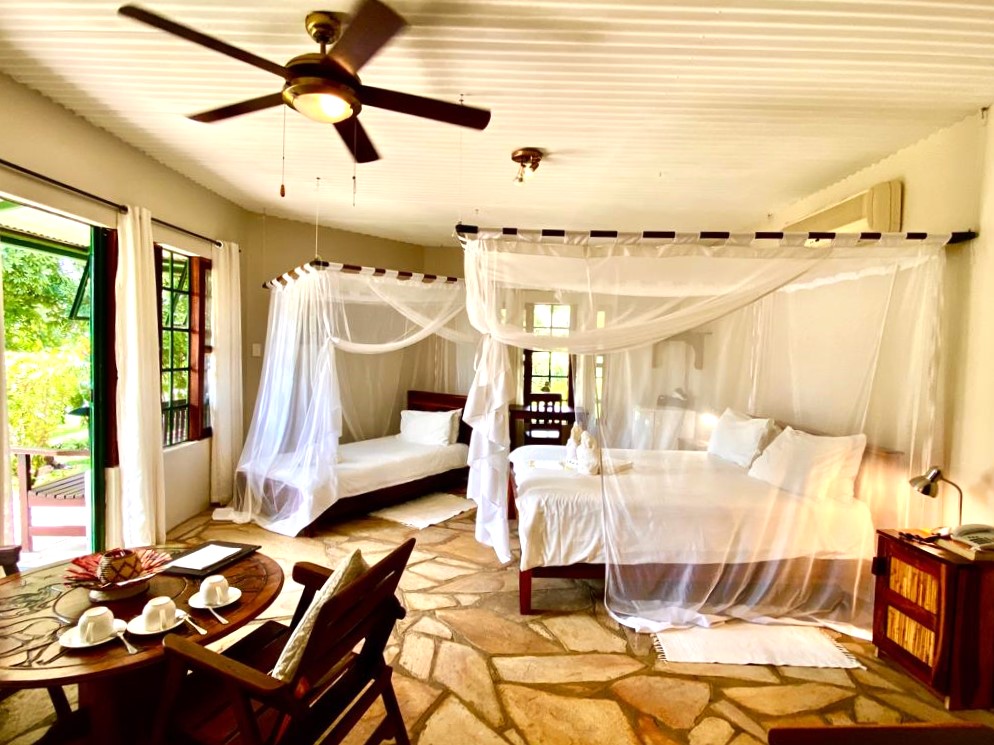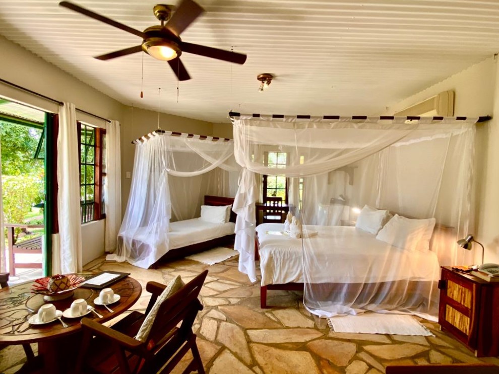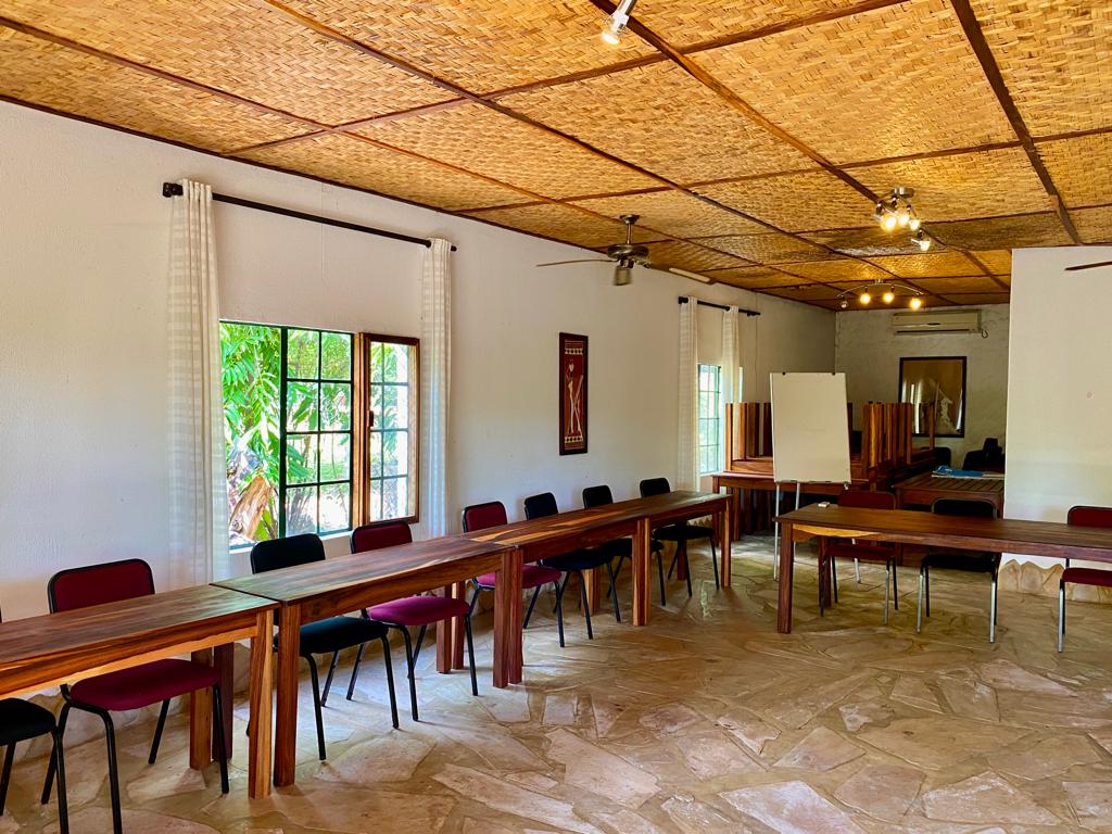 The lodge boasts a total of 8 spacious rooms, with 5 rooms offering 3 beds and 3 rooms with 2 beds, accommodating up to 21 guests. Each room is equipped with air conditioning, fans, fridges, mosquito screens, and mosquito nets. Guests can enjoy a fully equipped restaurant and kitchen, a well-stocked bar with a wine fridge, and a conference room with a capacity of 30-40 people. Other amenities include a small laundry, storeroom, and solar-powered lighting.
