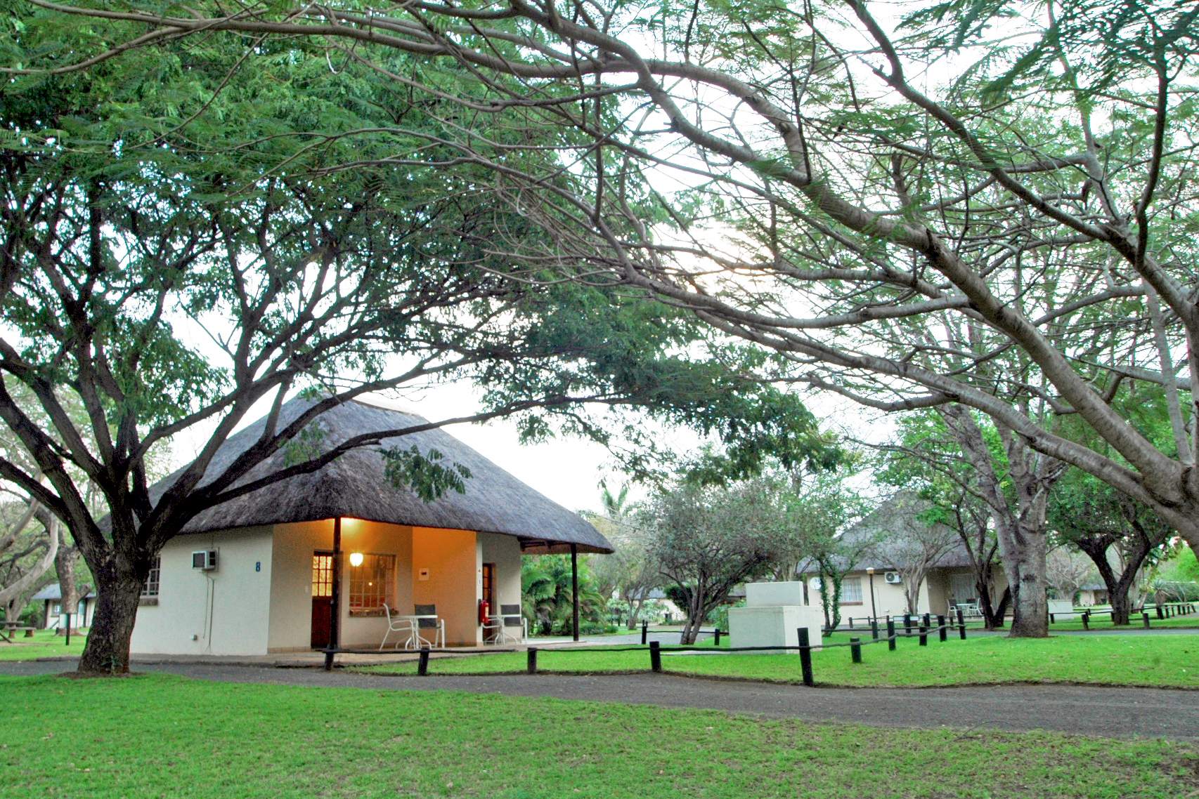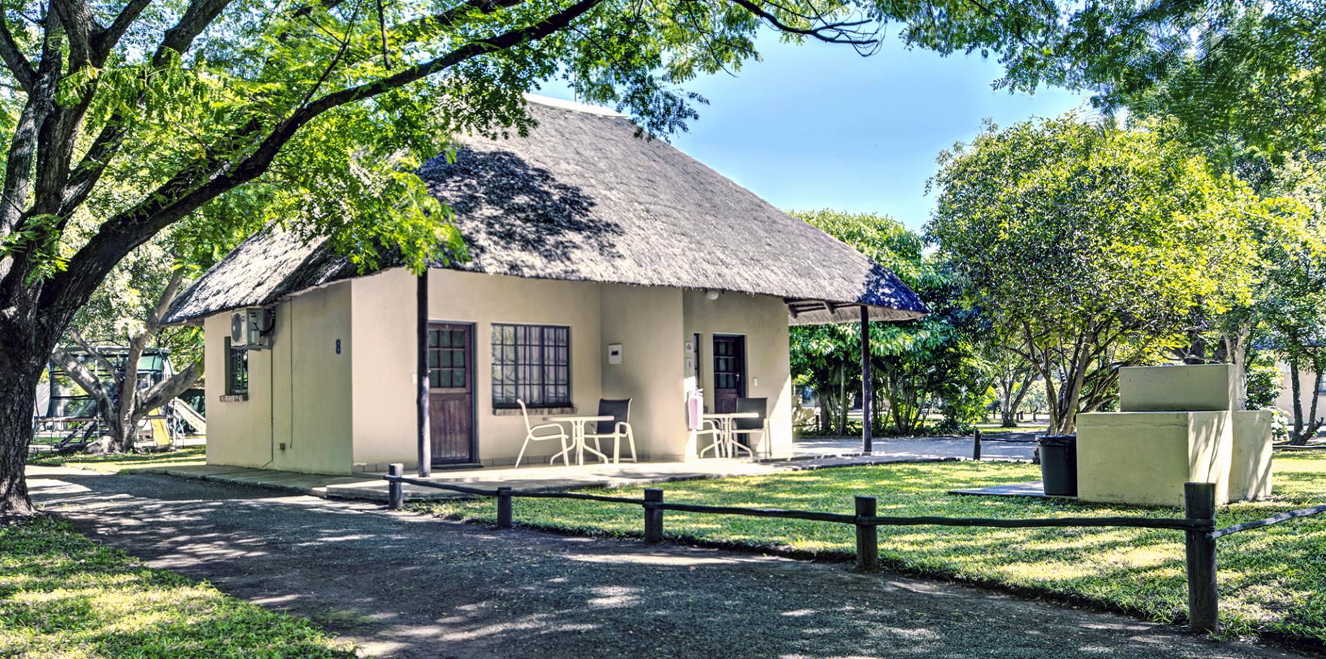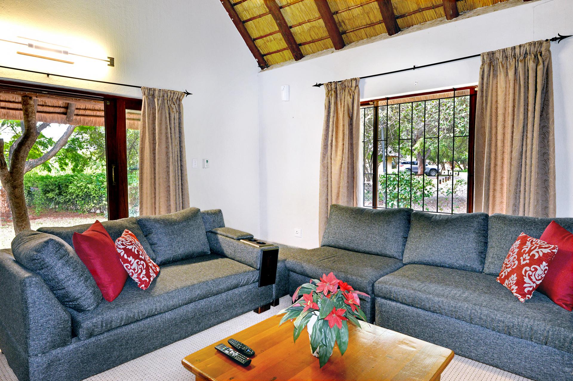 The lodge is self-sufficient with Eskom electricity, a backup generator, borehole water, and a recent solar backup system. It comprises 14 chalets, six two-bedroom cottages, a restaurant, bar, and pool, all with air conditioning, flatscreen TVs, digital safes, en suite bathrooms, and private braai facilities.