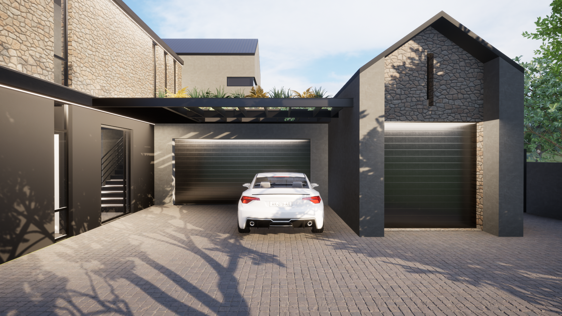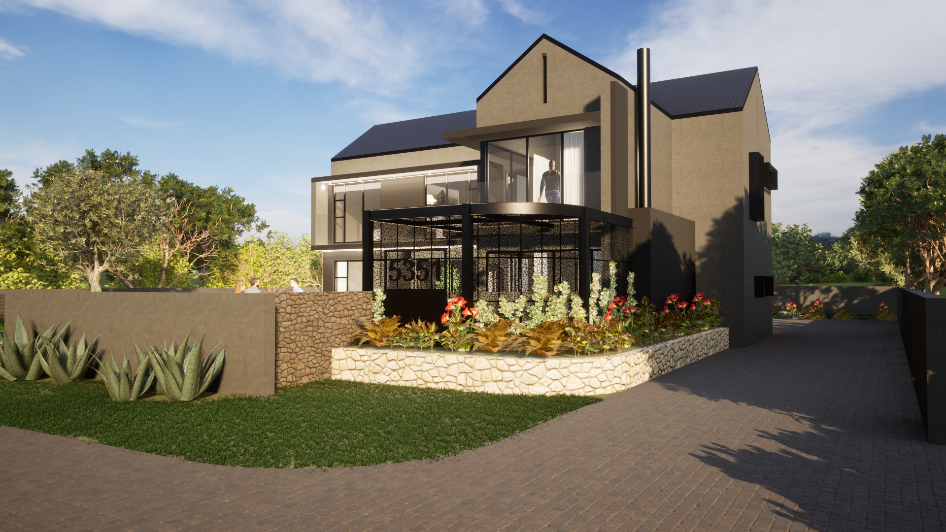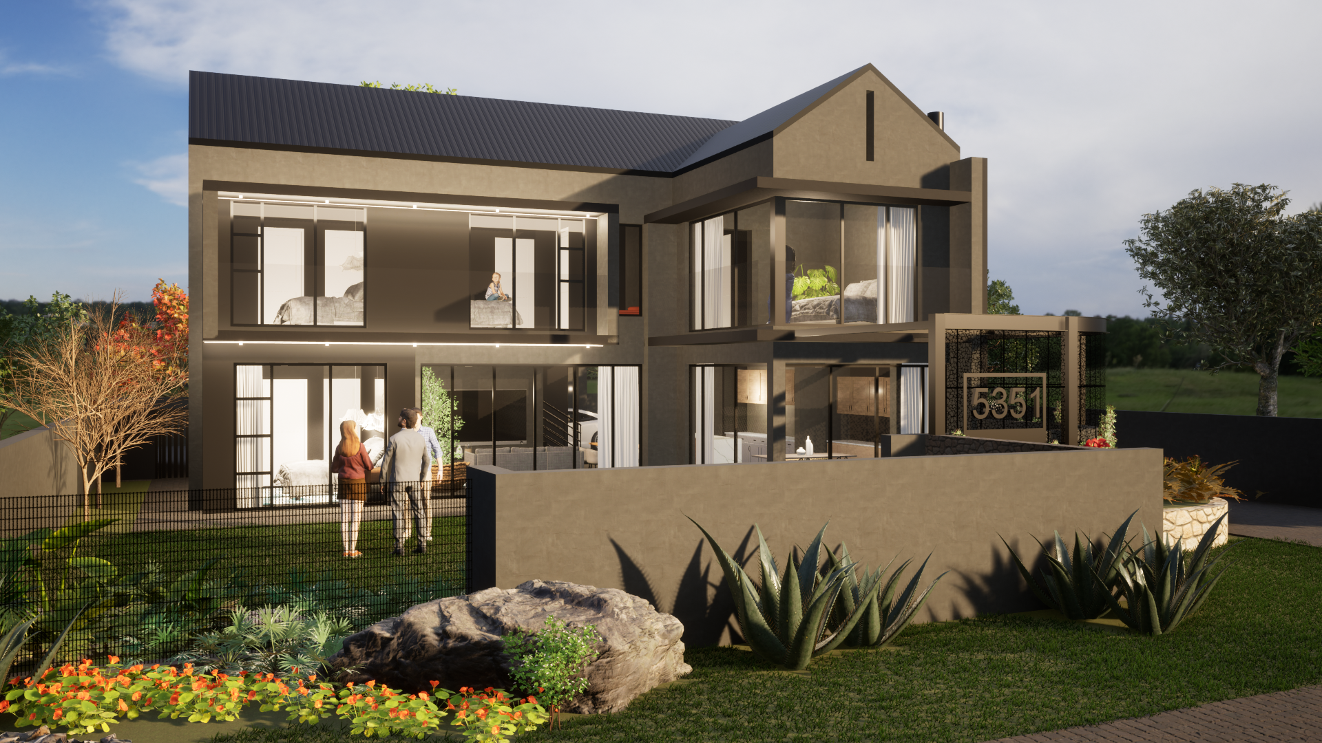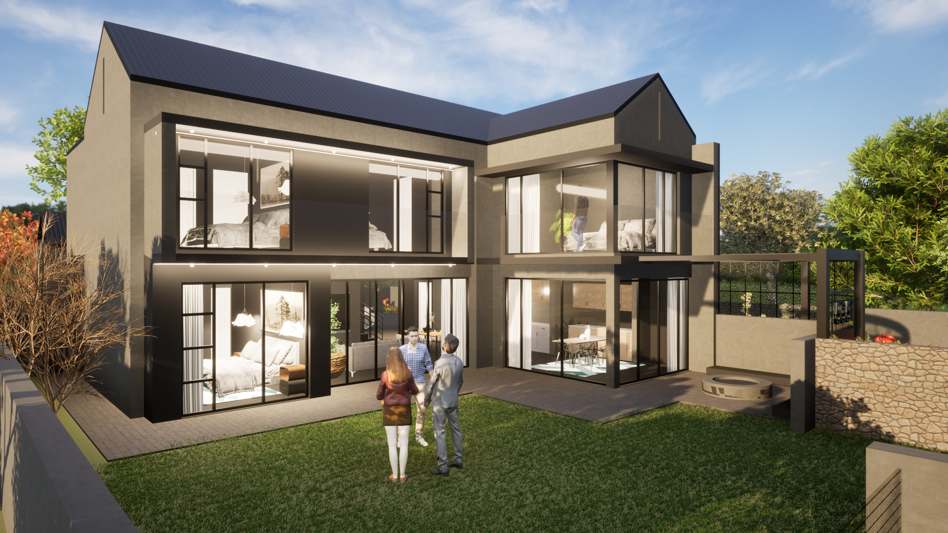 The ground floor of this home features seamless open-plan living, including a lounge, dining room, and a custom-feature kitchen with a separate scullery and laundry room, as well as an enclosed patio. The perfectly situated boma enhances outdoor living. Completing the ground floor are a guest cloakroom and a guest bedroom with an en-suite bathroom.