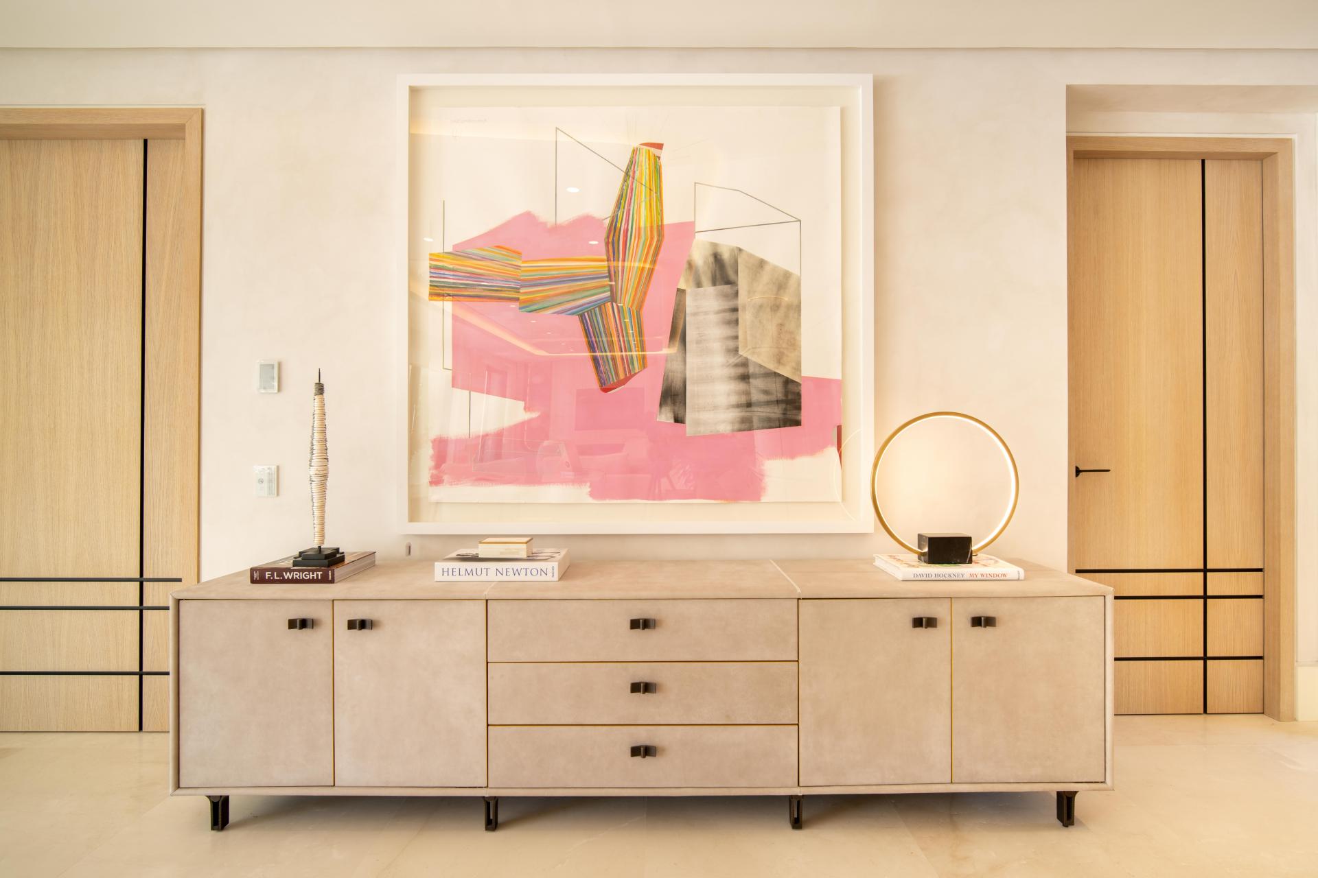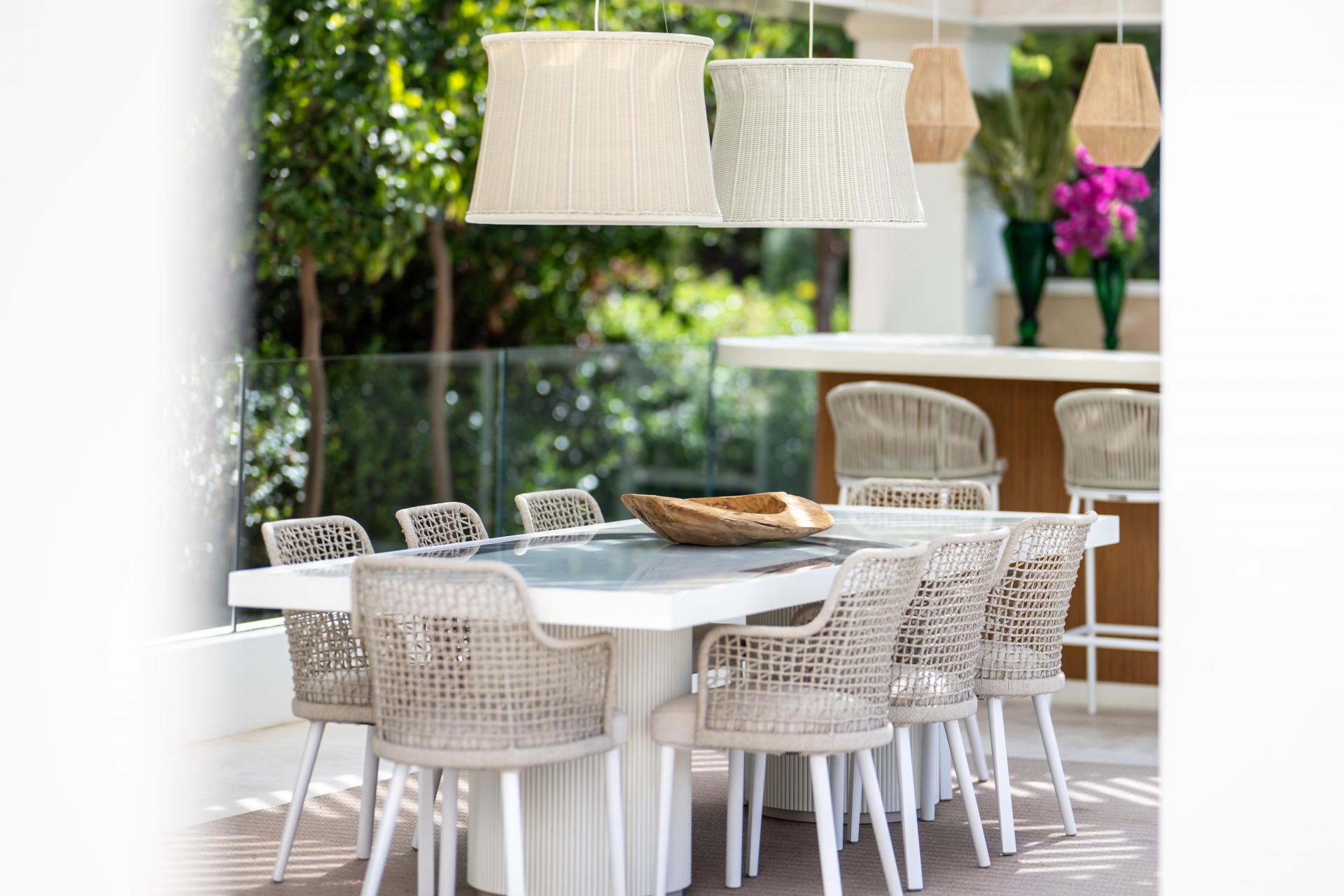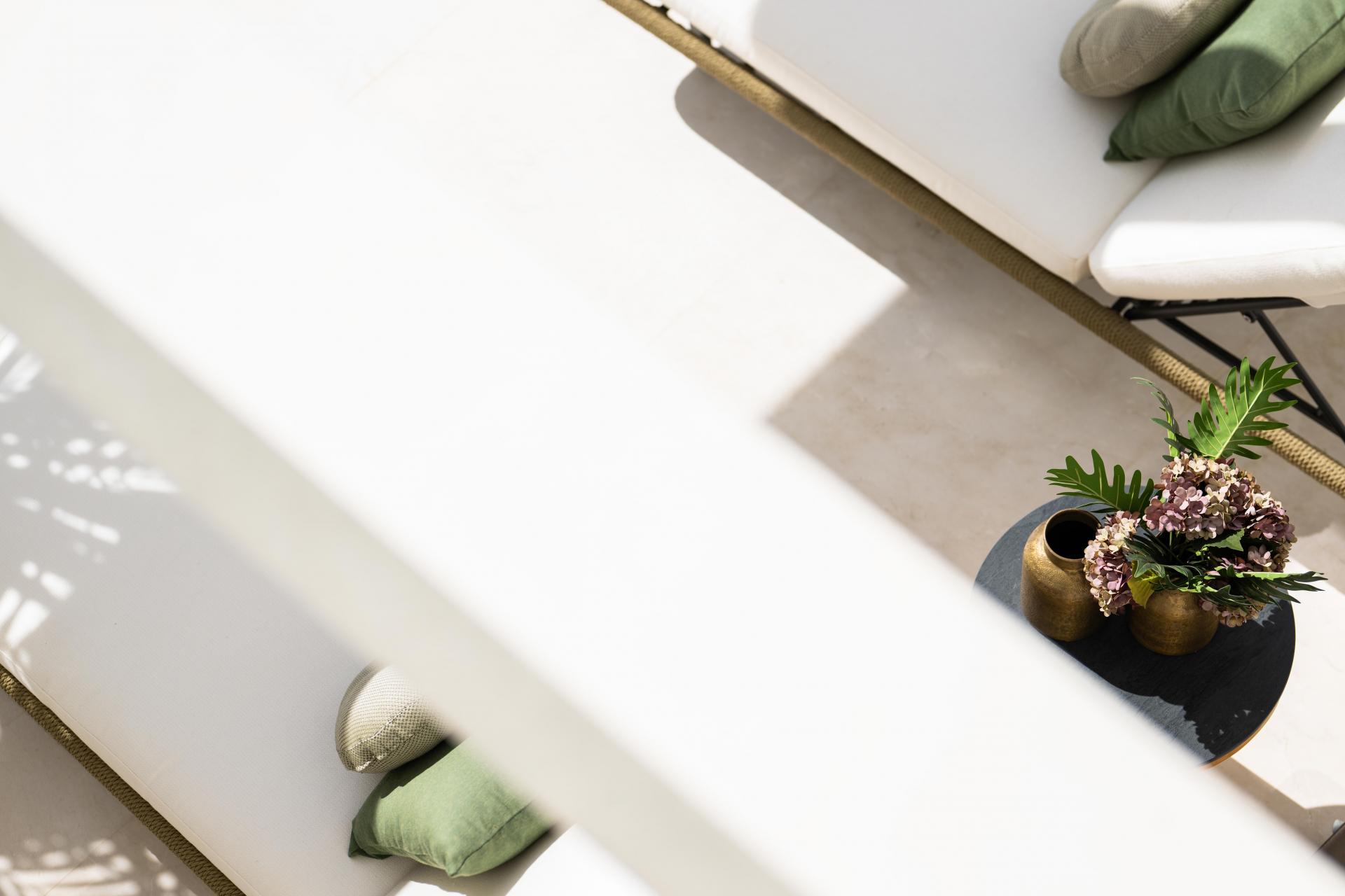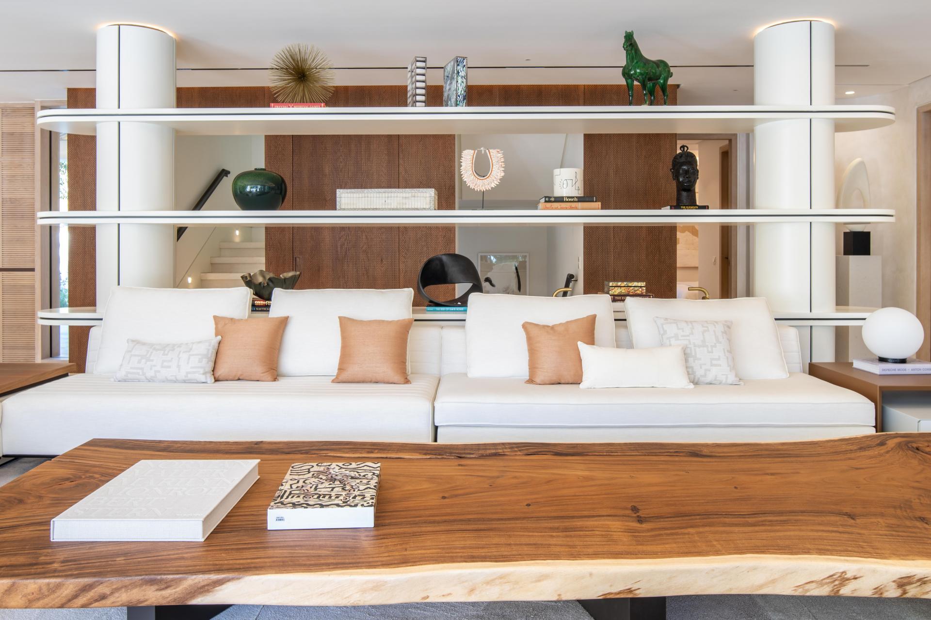 Inside, the atmosphere is equally inviting. Enter the spacious living area, where the neutral colour palette creates a calming ambience. Refined furniture selections by Pedro Peña combine aesthetics with comfort, while soft LED lighting integrated into the ceiling adds a modern touch. Here, every corner is designed to make you feel at peace, allowing you to relax after a long day or entertain guests in style. The open layout ensures a seamless flow from one room to the next, effortlessly connecting indoor and outdoor spaces.