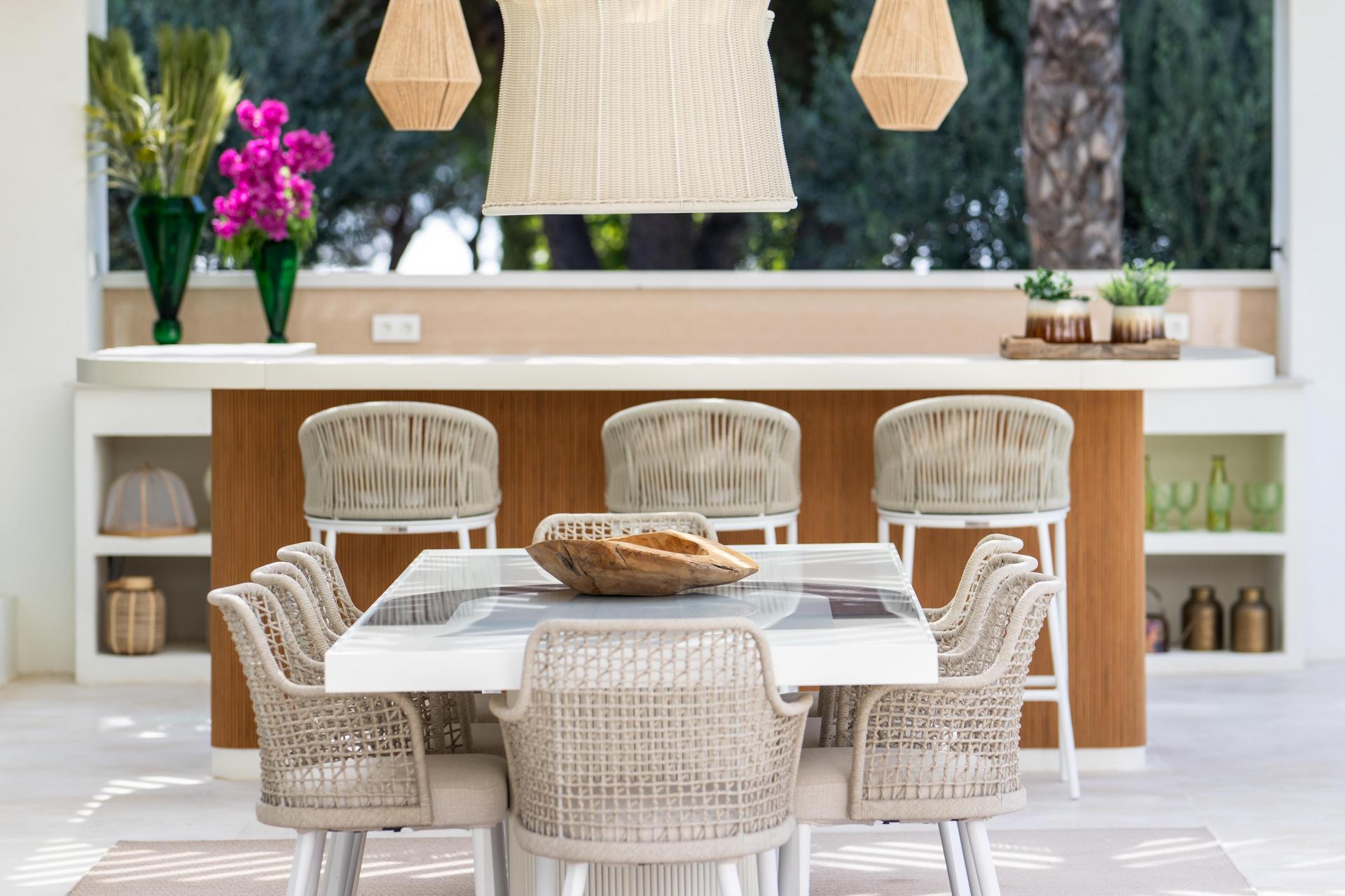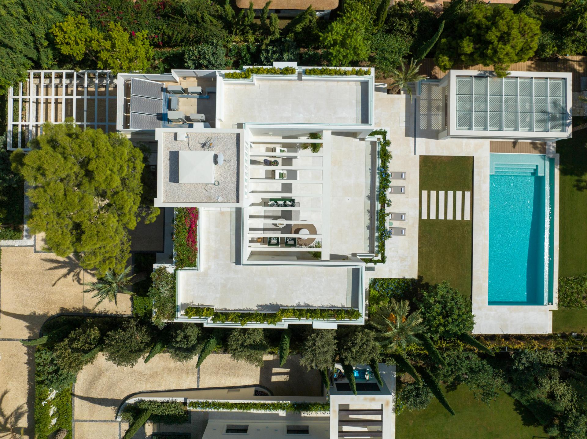 Step into a world of modern elegance, where the villa’s striking white exterior and symmetrical design by Francisco Guillén reflect timeless sophistication. The expansive outdoor terraces invite you to unwind in the lush garden, enjoy a swim in the large private pool, or entertain guests in the covered alfresco dining area, complete with a stylish outdoor bar. The subtle sounds of nature blend seamlessly with luxurious amenities, offering multiple spaces for relaxation and social gatherings.